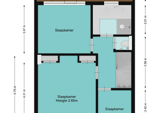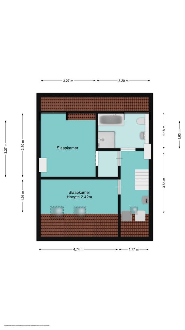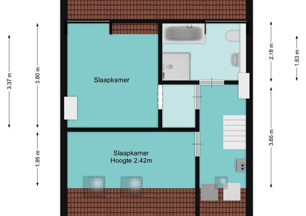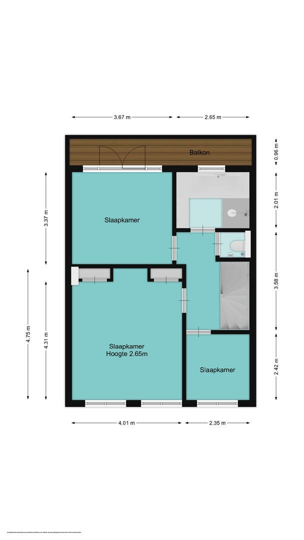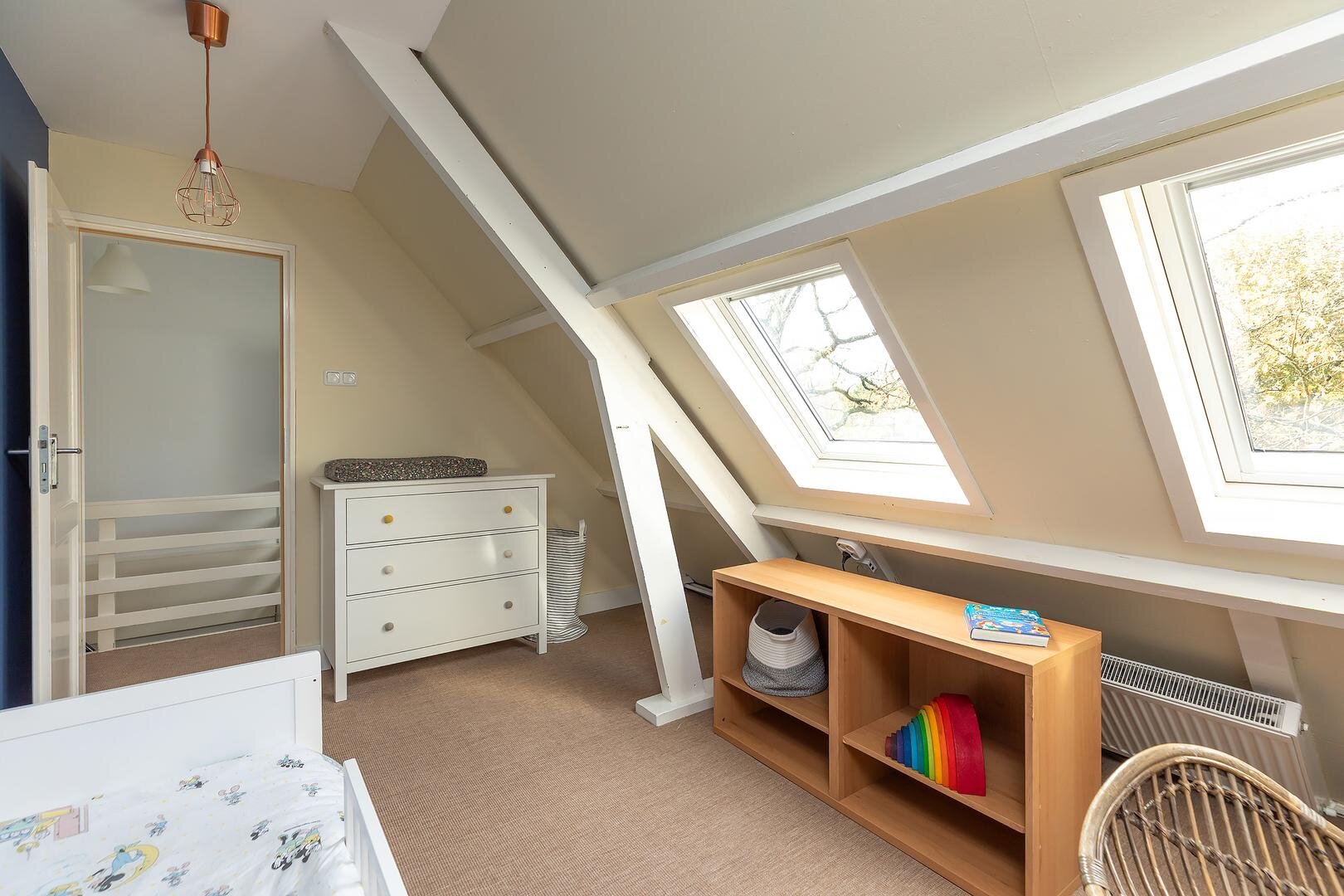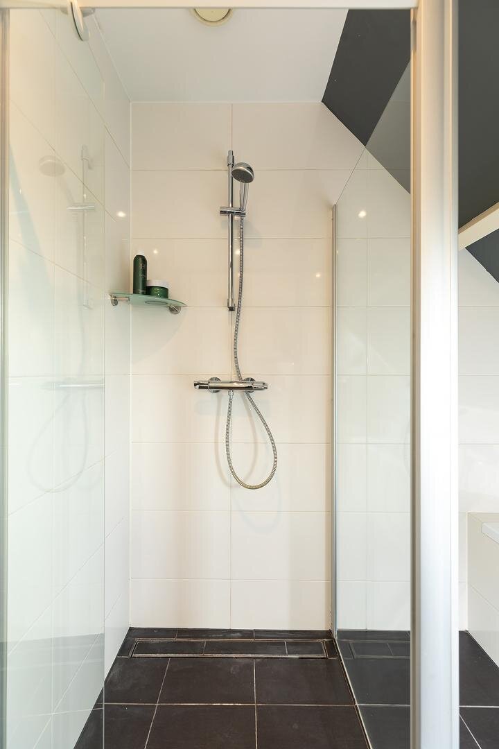 2e verdieping: overloop met dakraam, aansluiting wasapparatuur en opstelling c.v.-ketel, 2 goed bemeten slaapkamers, waarvan de kamer aan de achterzijde met dakkapel en de kamer aan de voorzijde met 2 dakramen. De 2e moderne badkamer met dakkapel is voorzien van ligbad, douche, wastafel en 3e toilet. Via vlizotrap bereikbare bergvliering.
