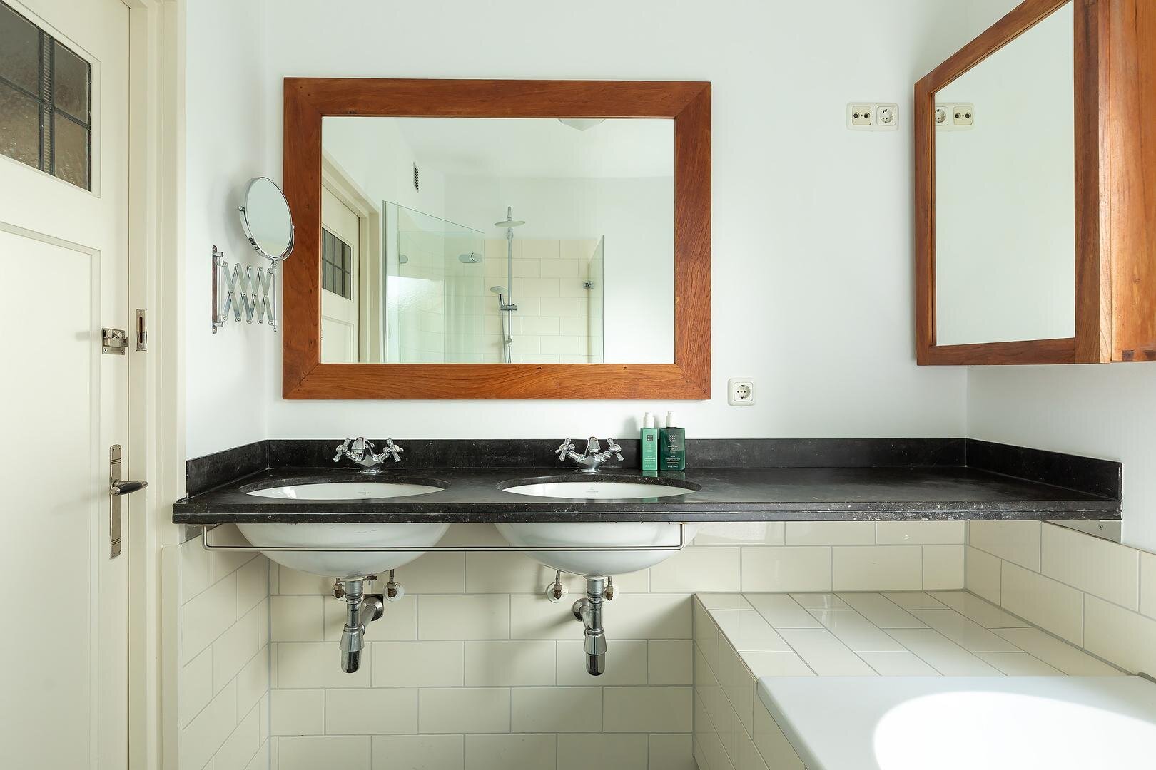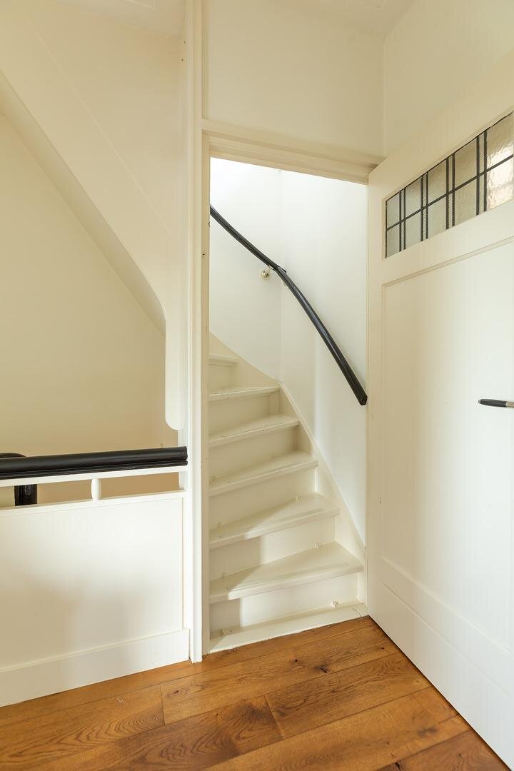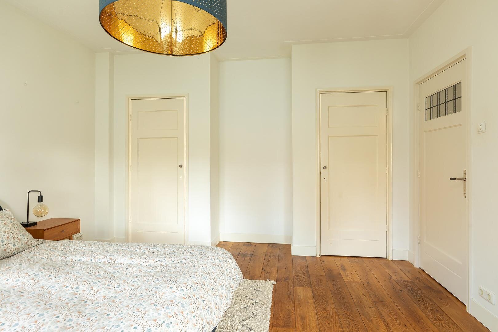1e verdieping: ruime overloop met separaat toilet, grote slaapkamer aan de voorzijde met vaste kastruimte, slaapkamer aan achterzijde met openslaande deuren naar balkon over gehele breedte van de woning, derde kleine slaapkamer aan de voorzijde. Badkamer aan de achterzijde met ligbad, dubbele wastafel in hardstenen blad en inloopdouche. De vloer in de badkamer is vervaardigd uit Belgisch hardsteen.