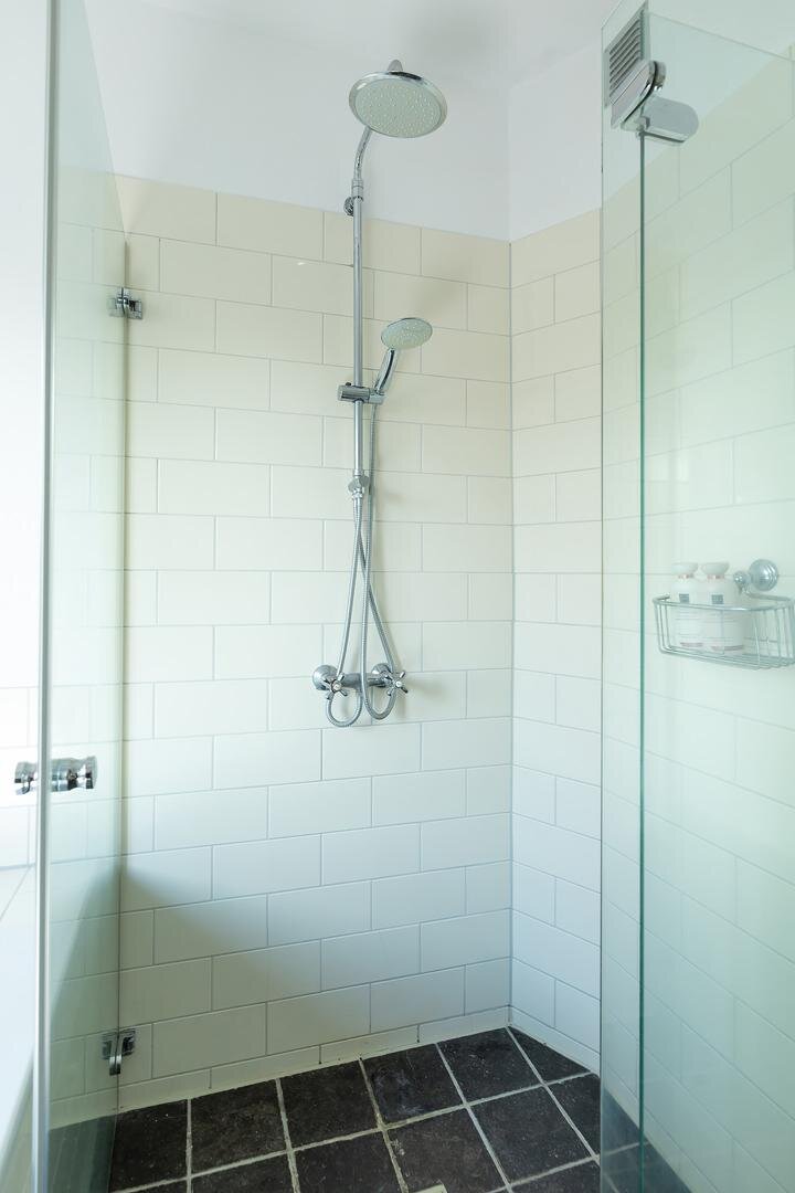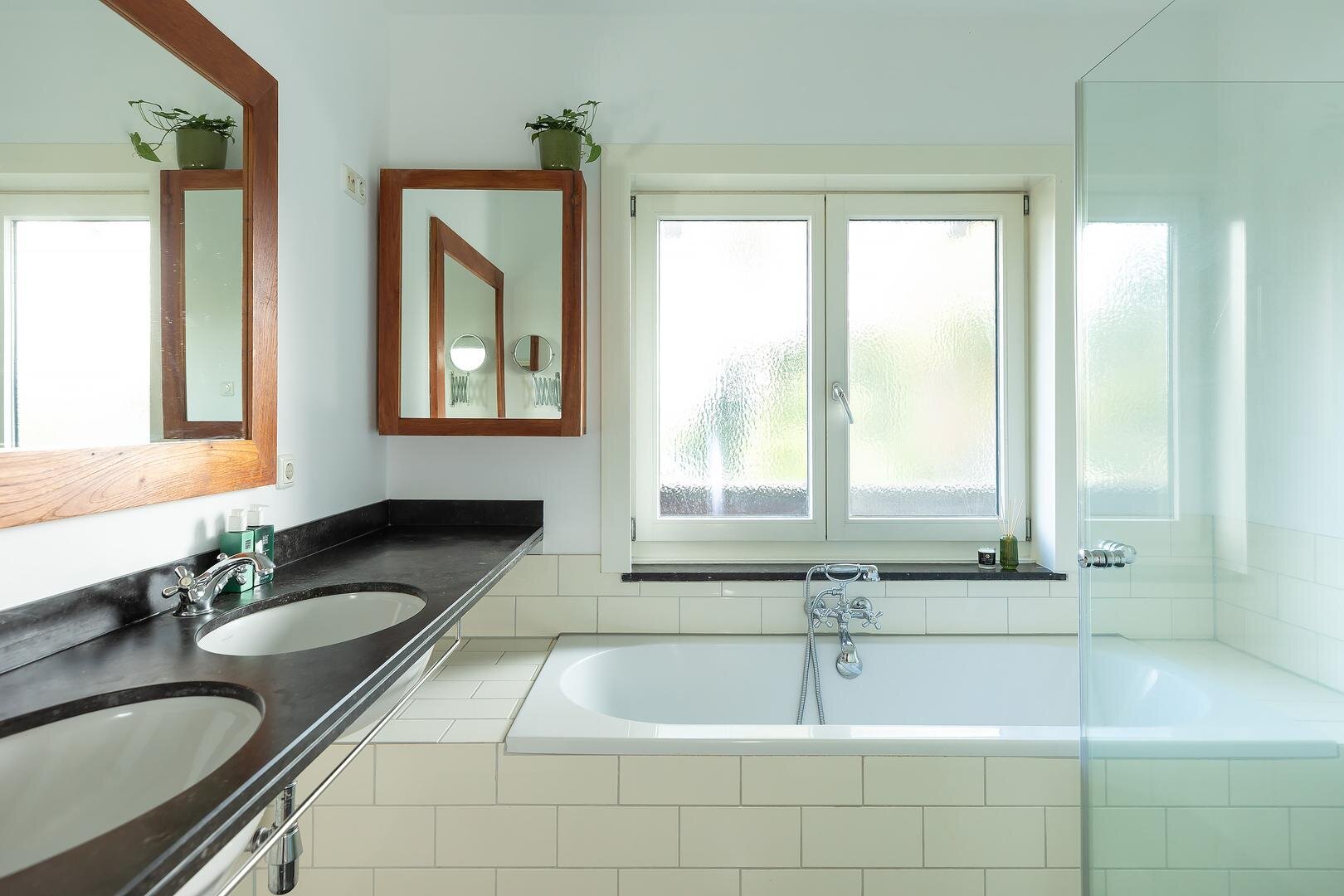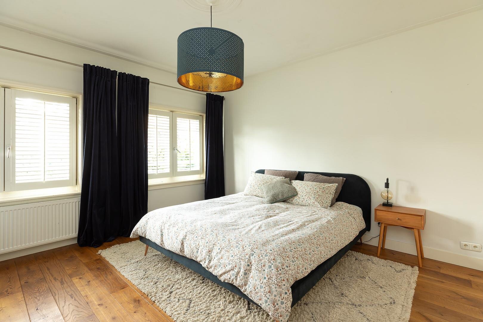 1e verdieping: ruime overloop met separaat toilet, grote slaapkamer aan de voorzijde met vaste kastruimte, slaapkamer aan achterzijde met openslaande deuren naar balkon over gehele breedte van de woning, derde kleine slaapkamer aan de voorzijde. Badkamer aan de achterzijde met ligbad, dubbele wastafel in hardstenen blad en inloopdouche. De vloer in de badkamer is vervaardigd uit Belgisch hardsteen.