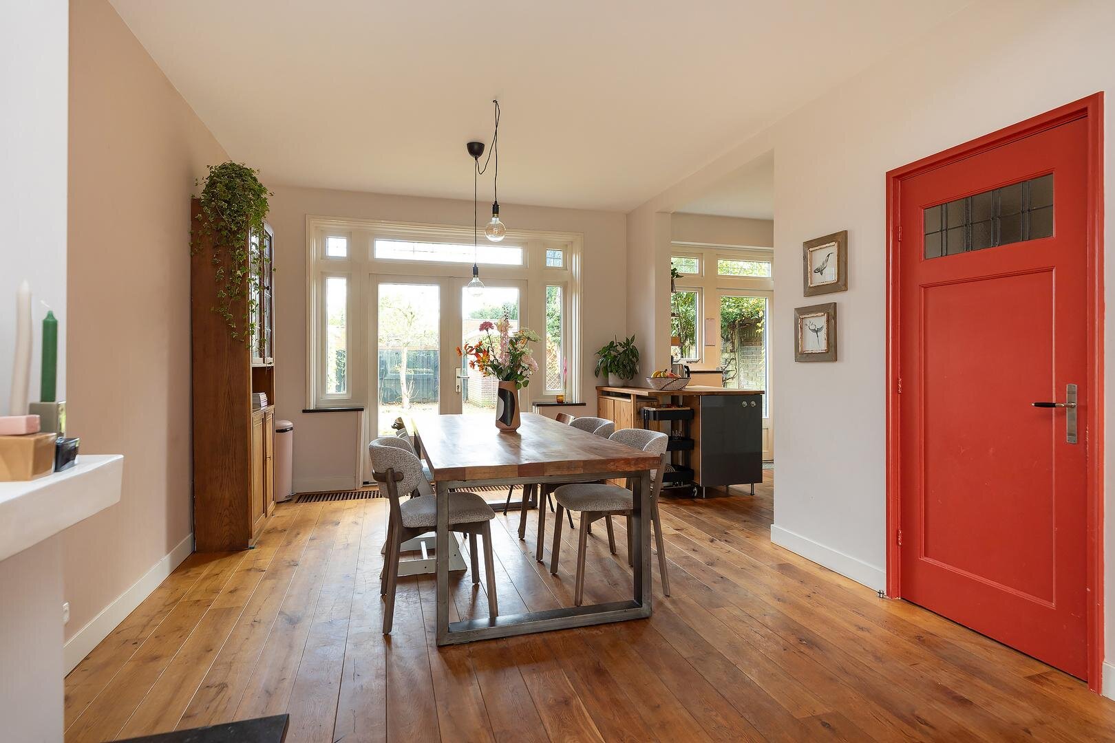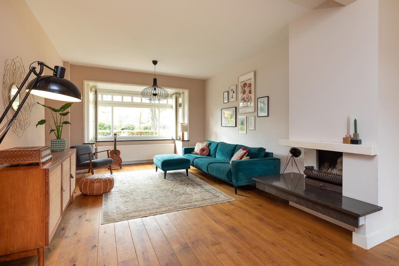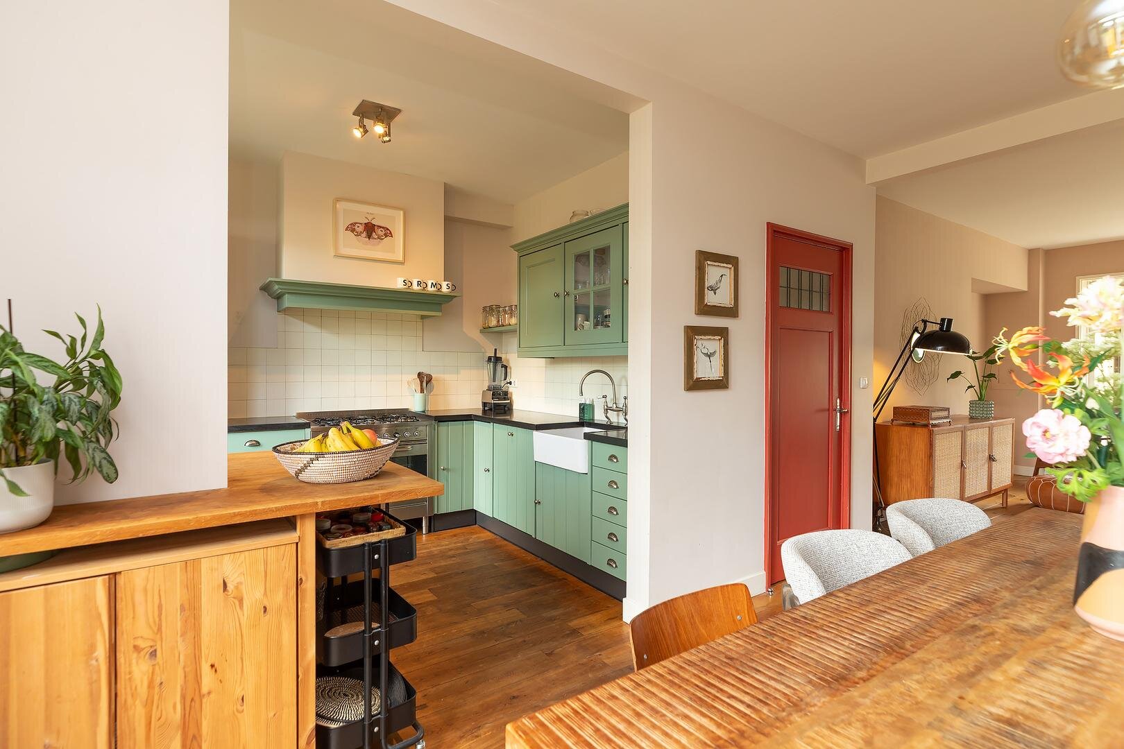 Indeling: entree, authentieke vestibule met originele tegels en glas-in-lood, hal, toilet met fonteintje, toegang provisiekelder. Royale en lichte woon-/eetkamer met erker aan de voorzijde, open haard, eikenhouten vloer en openslaande deuren naar de achtertuin. Halfopen keuken in L-opstelling voorzien van stenen blad, 6- pits Boretti fornuis met oven, vaatwasser, koelkast, combi-magnetron en deur naar de achtertuin.
