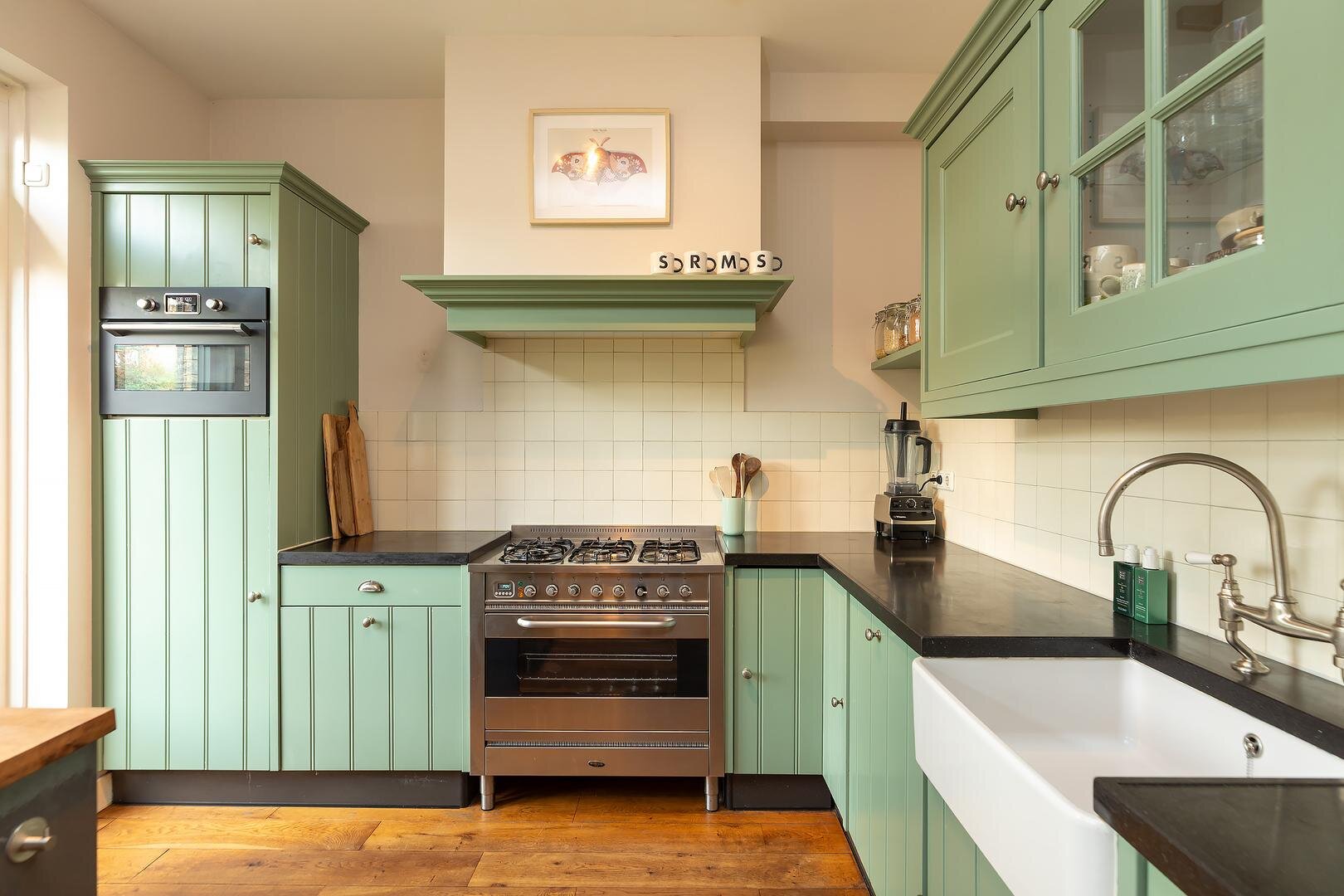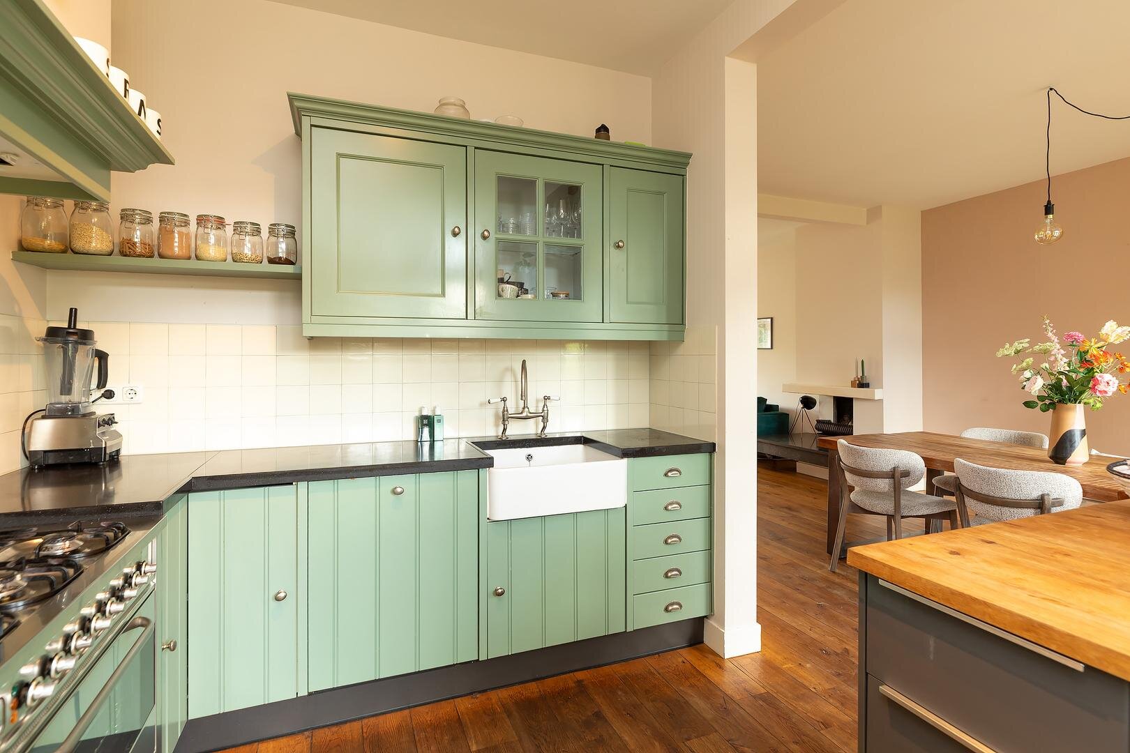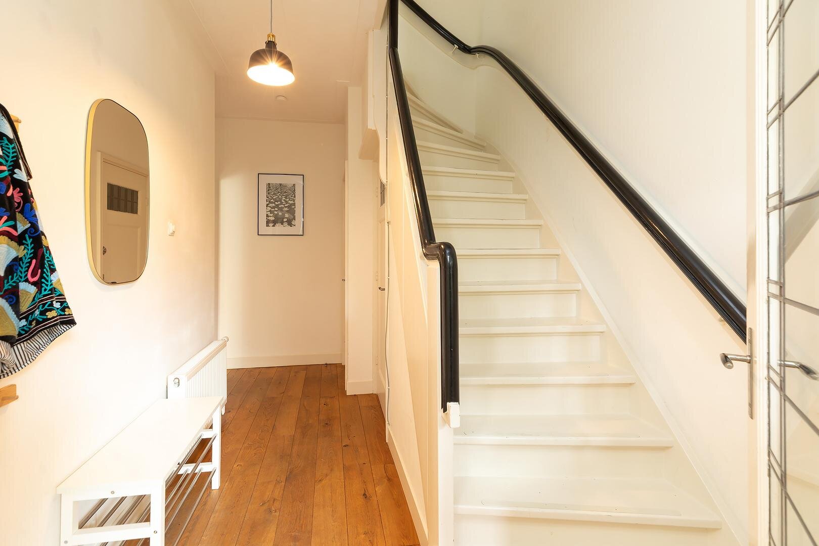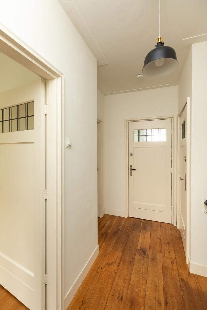 Indeling: entree, authentieke vestibule met originele tegels en glas-in-lood, hal, toilet met fonteintje, toegang provisiekelder. Royale en lichte woon-/eetkamer met erker aan de voorzijde, open haard, eikenhouten vloer en openslaande deuren naar de achtertuin. Halfopen keuken in L-opstelling voorzien van stenen blad, 6- pits Boretti fornuis met oven, vaatwasser, koelkast, combi-magnetron en deur naar de achtertuin.