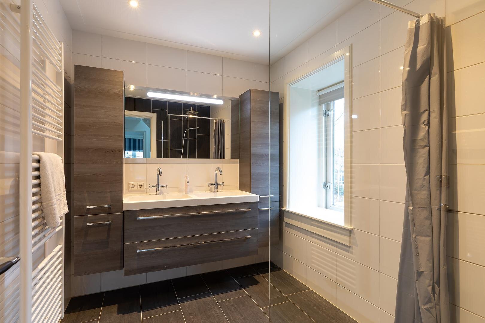 1e verdieping: overloop met toilet, 3 in grootte variërende slaapkamers waarvan de grote slaapkamer aan de achterzijde met vaste kasten en openslaande deuren naar het balkon, de slaapkamer aan de voorzijde beschikt tevens over vaste kasten. Moderne badkamer met dubbel wastafelmeubel, inloopdouche en handdoekradiator. De gehele eerste verdieping is voorzien van een laminaatvloer.