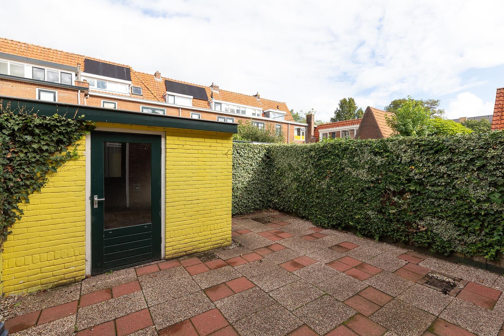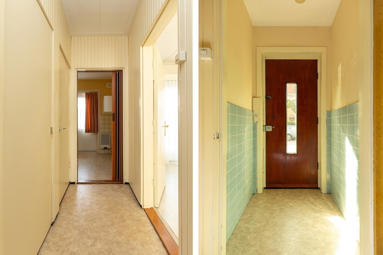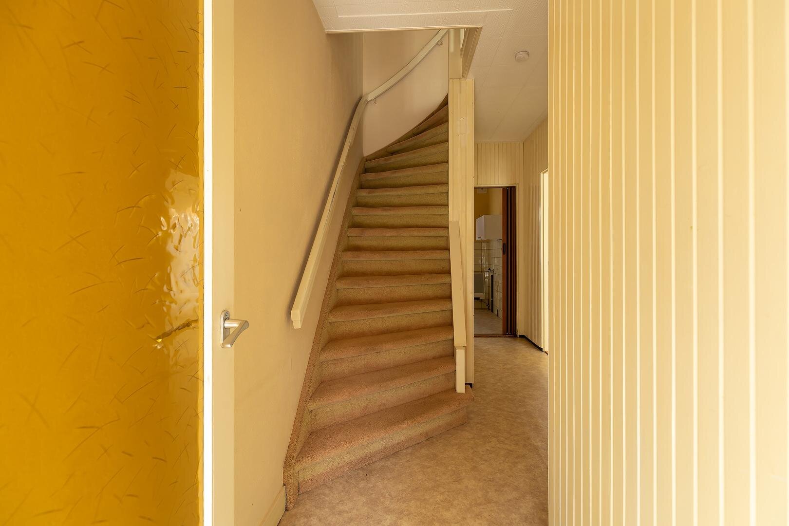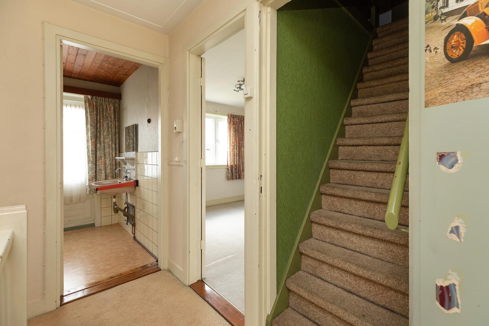 Entree/vestibule, hal, trapkast, toilet met fonteintje, woon-/eetkamer met openslaande deuren naar de achtertuin en een charmante erker aan de voorzijde, separate keuken met een deur naar de achtertuin die voorzien is van een stenen schuur en een achterom.