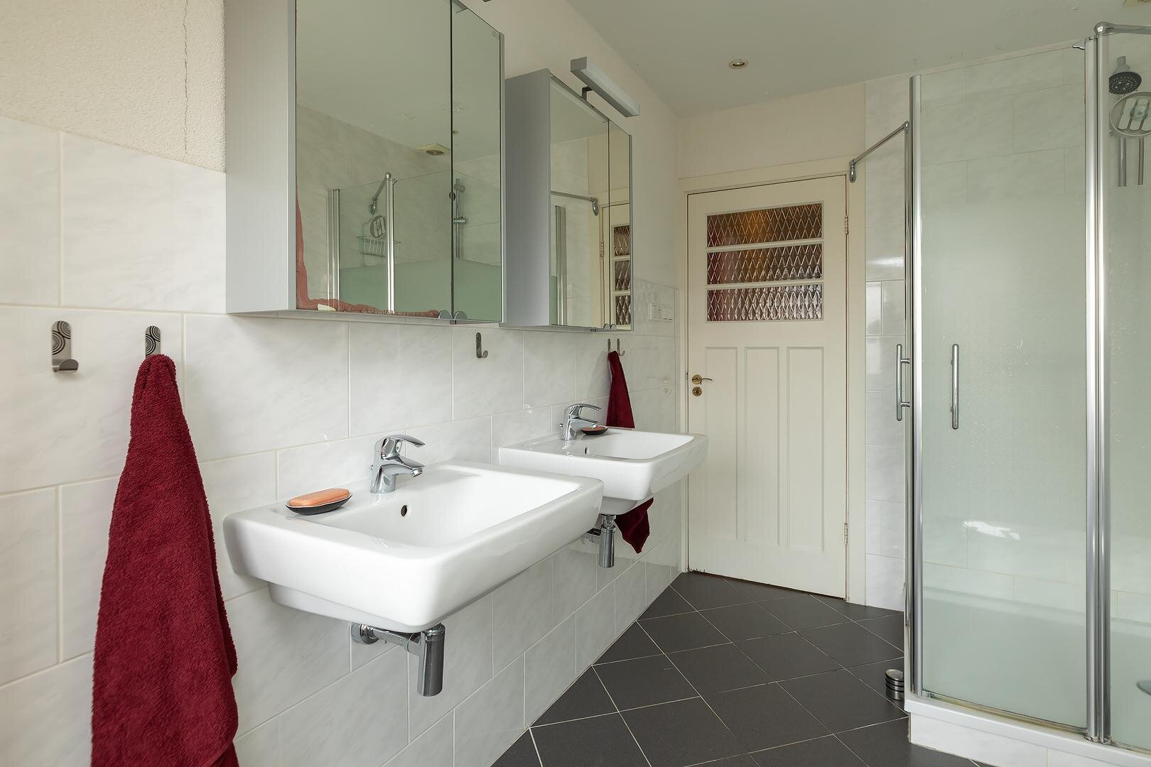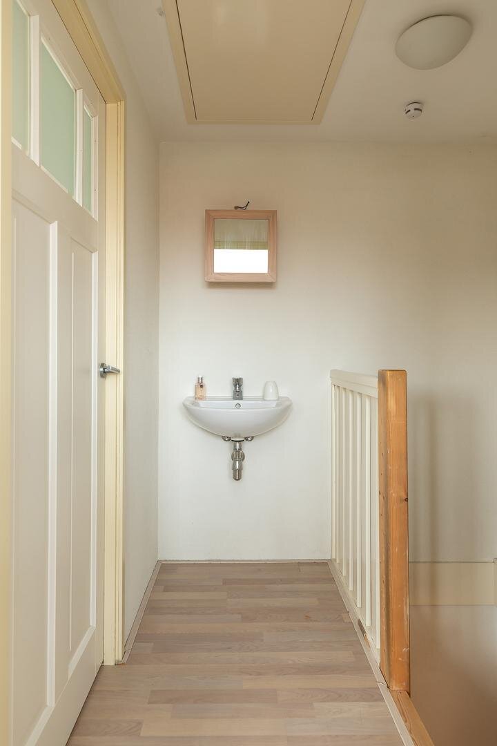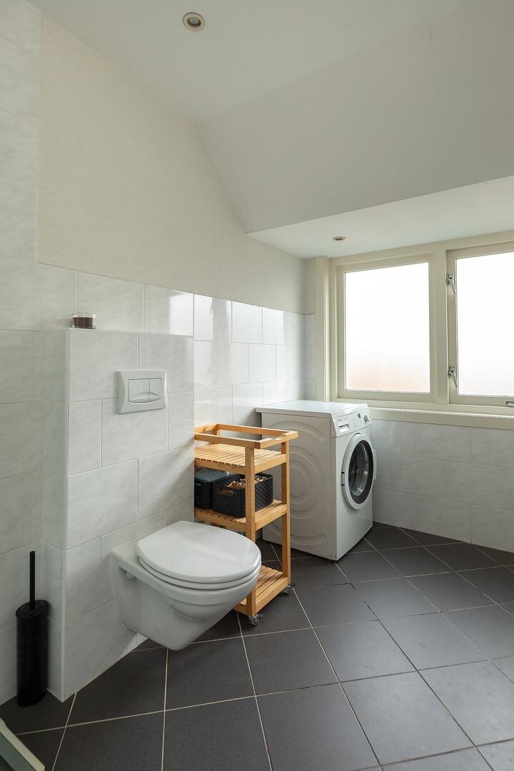 Eerste verdieping: overloop met inbouwkast, 1e grote slaapkamer aan de achterzijde met inbouwkast, uitgebouwde badkamer voorzien van douche, dubbele wastafel, toilet en wasmachine-aansluiting, 2e kleine slaap-/werkkamer aan de voorzijde, ruime 3e slaapkamer aan de voorzijde eveneens met inbouwkast.
