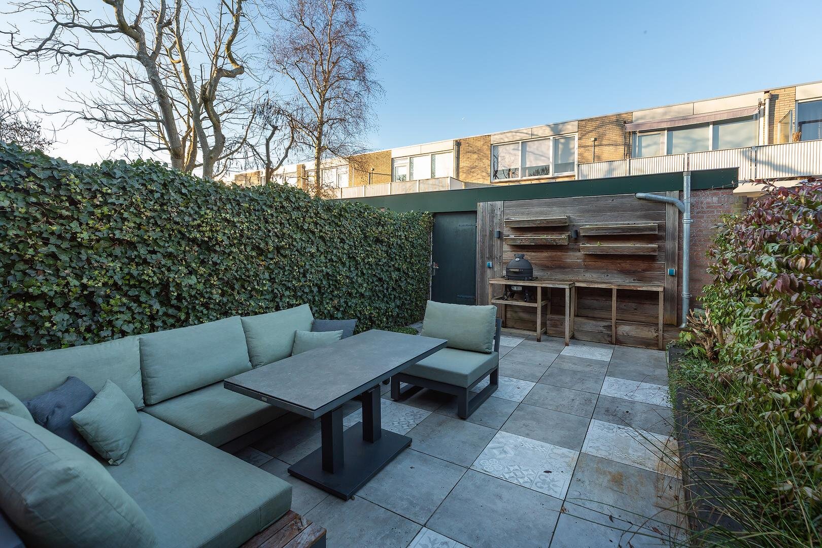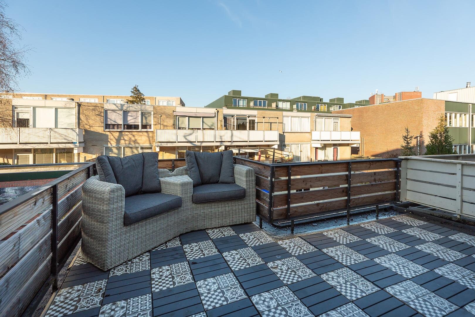 De woning beschikt over zowel een tuin als een dakterras, waardoor er op verschillende momenten van de dag een fijne plek is om buiten te zitten. De schuur zorgt voor praktische opslagruimte en maakt het geheel compleet.