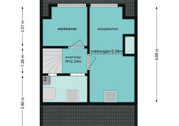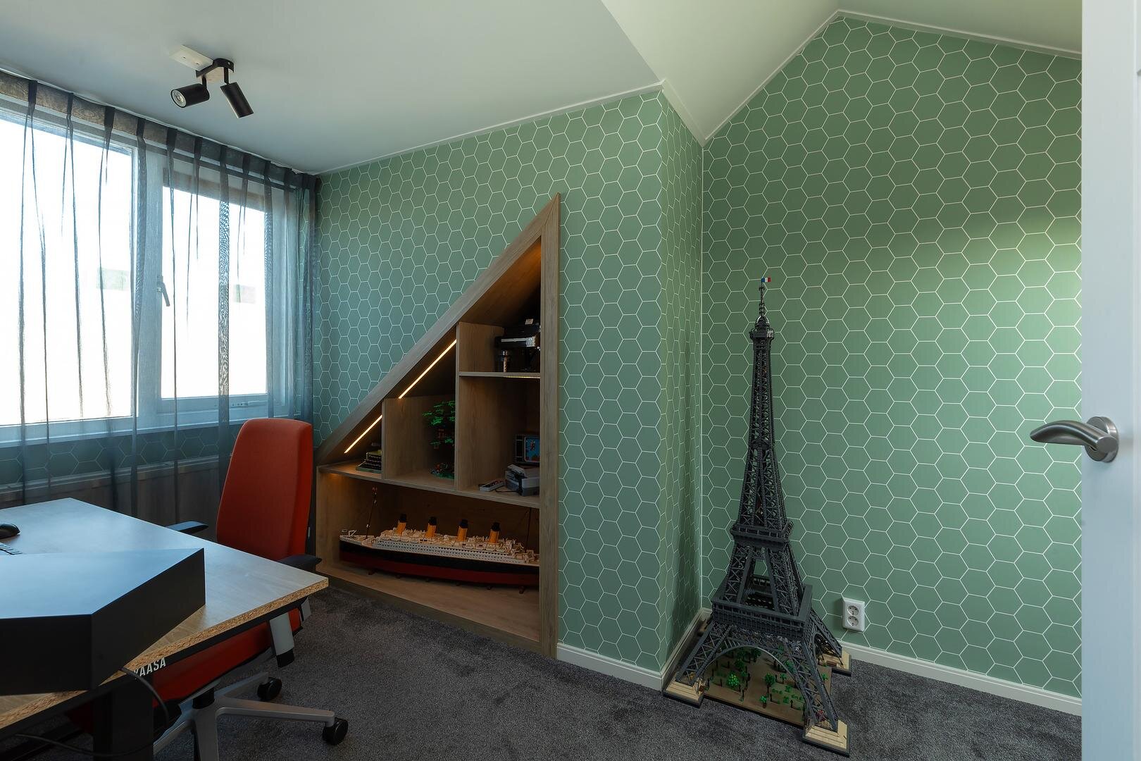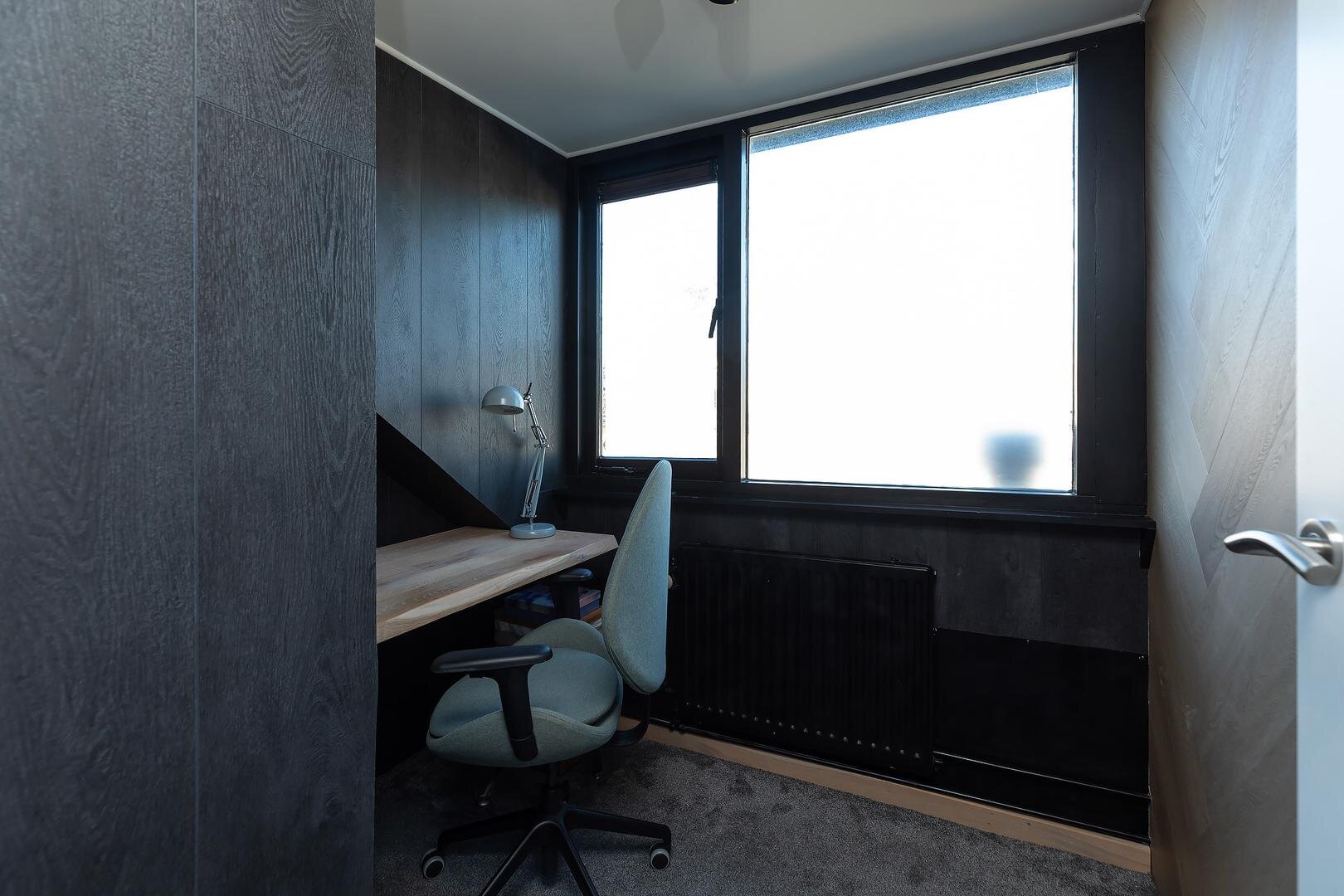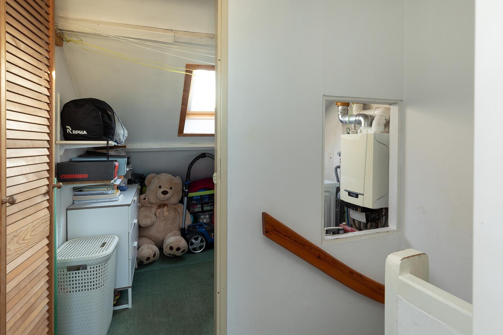 Overloop met toegang tot een ruime slaapkamer, een aparte werkkamer en een praktische ruimte met opstelling voor wasmachine en droger, evenals de cv-installatie.