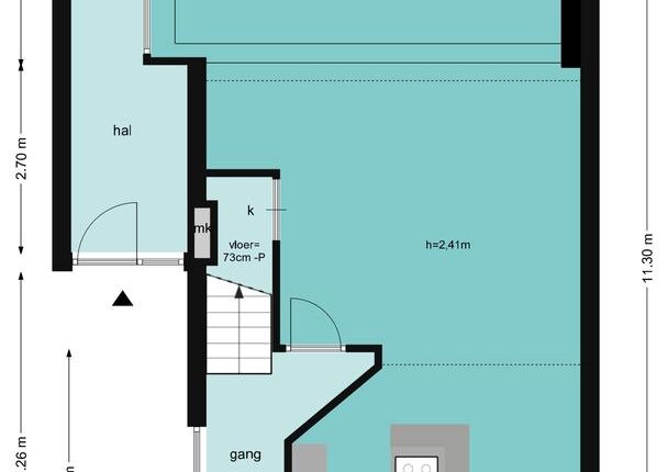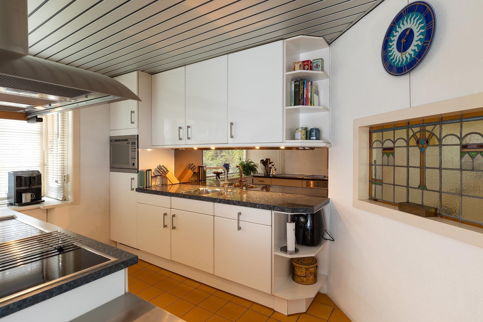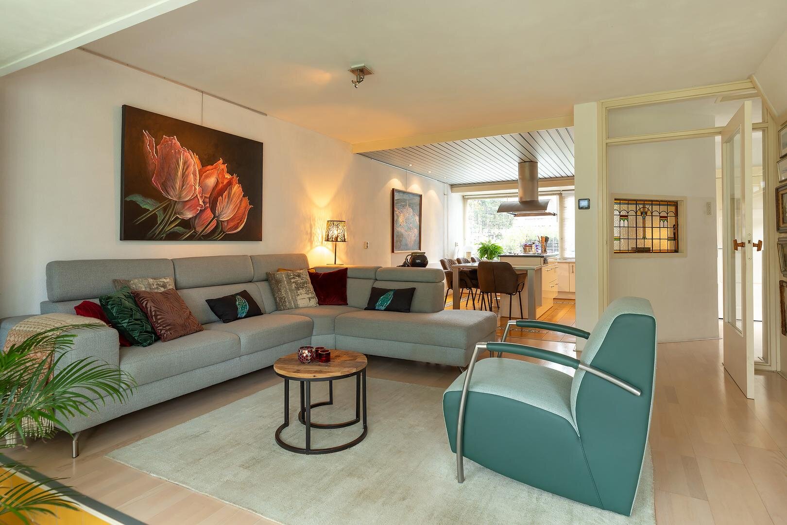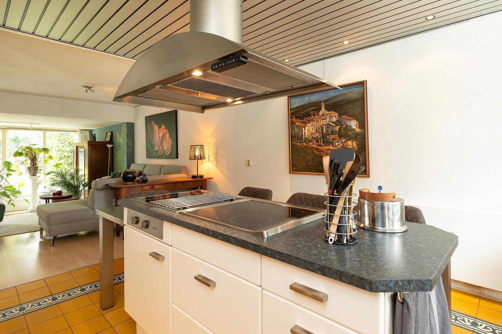 Indeling: entree via de zijkant van de woning, lichte hal met meterkast en voorzien van plavuizenvloer, toegang naar de achtertuin en via glazen wand met deur toegang naar de verdiepte uitbouw ook voorzien van plavuizenvloer. Via 2 tredes naar het royale zitgedeelte met trapkast en deur naar de gang met trapopgang en toilet met fonteintje. De woonkeuken is aan de voorzijde gesitueerd met kookeiland, elektrische kook- en teppanyakiplaat, afzuigkap, combi-magnetron, koelkast, vriezer, vaatwasser en dubbele spoelbak.
