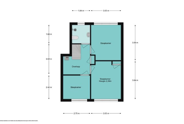 Eerste verdieping: overloop, drie ruime slaapkamers, eenvoudige badkamer.