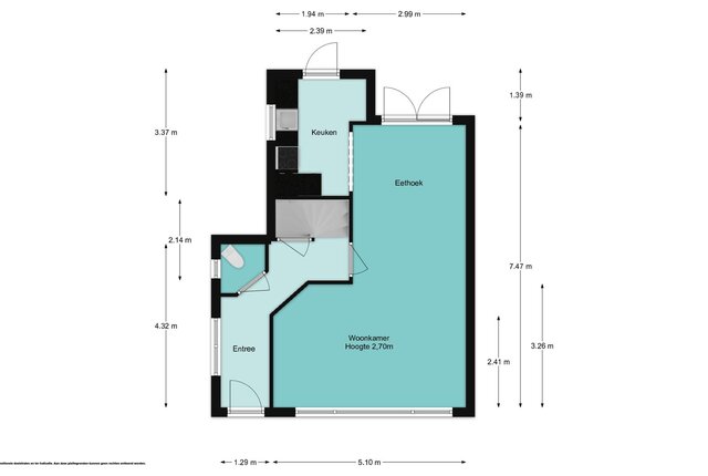 Begane grond: entree, hal, toilet, trapopgang, lichte L-vormige woon-/eetkamer met openslaande deuren naar de tuin, halfopen keuken.