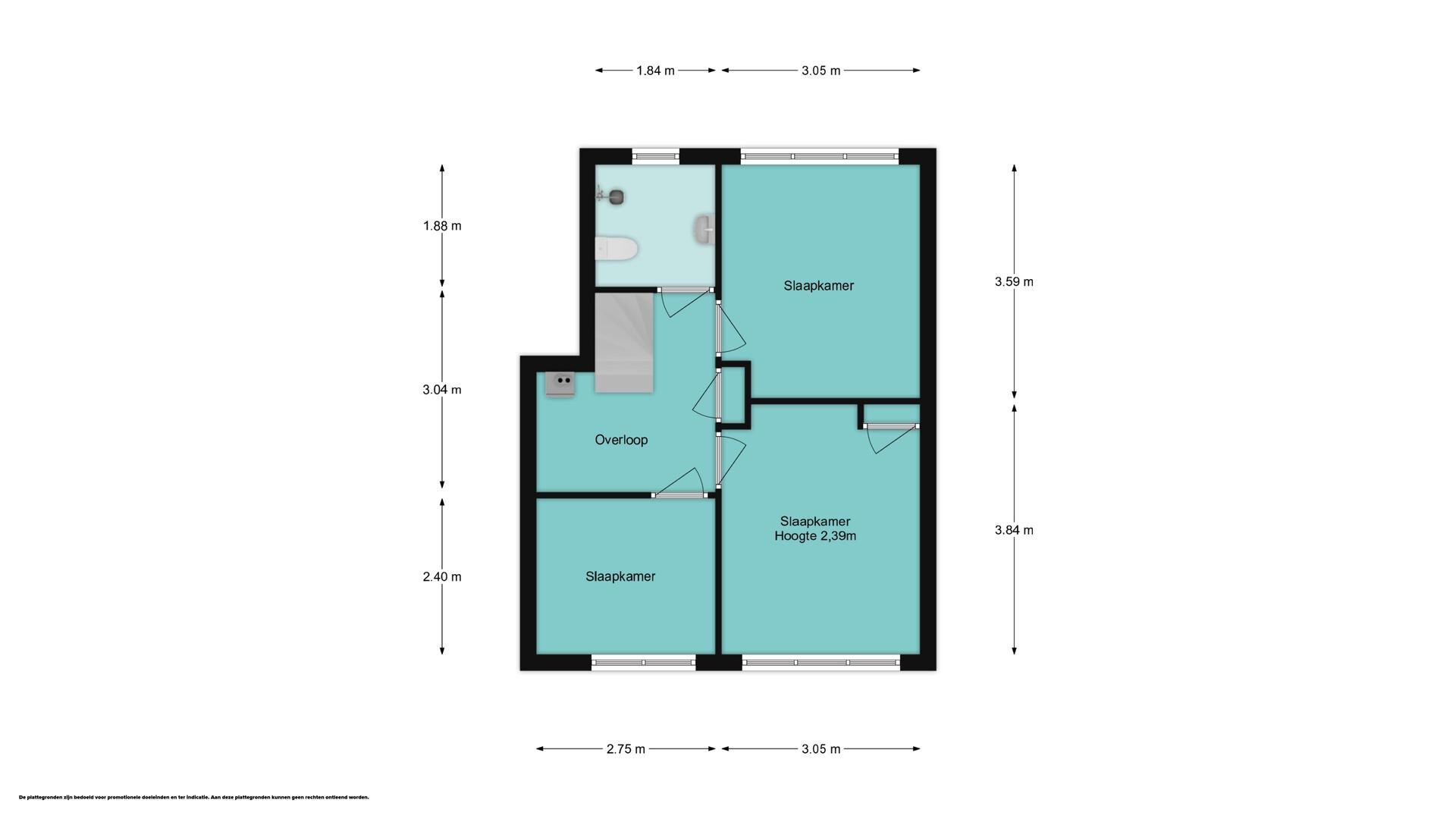 Eerste verdieping: overloop, drie ruime slaapkamers, eenvoudige badkamer.