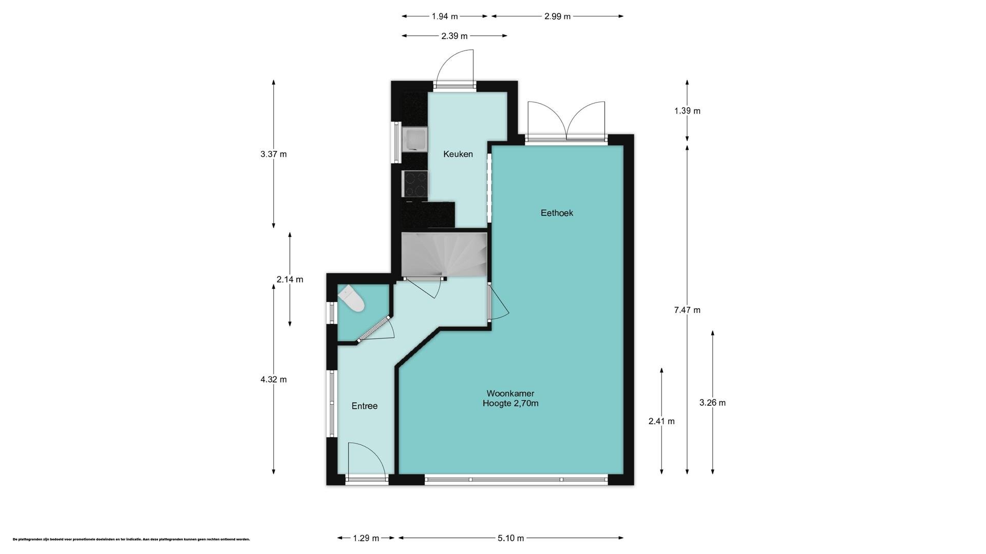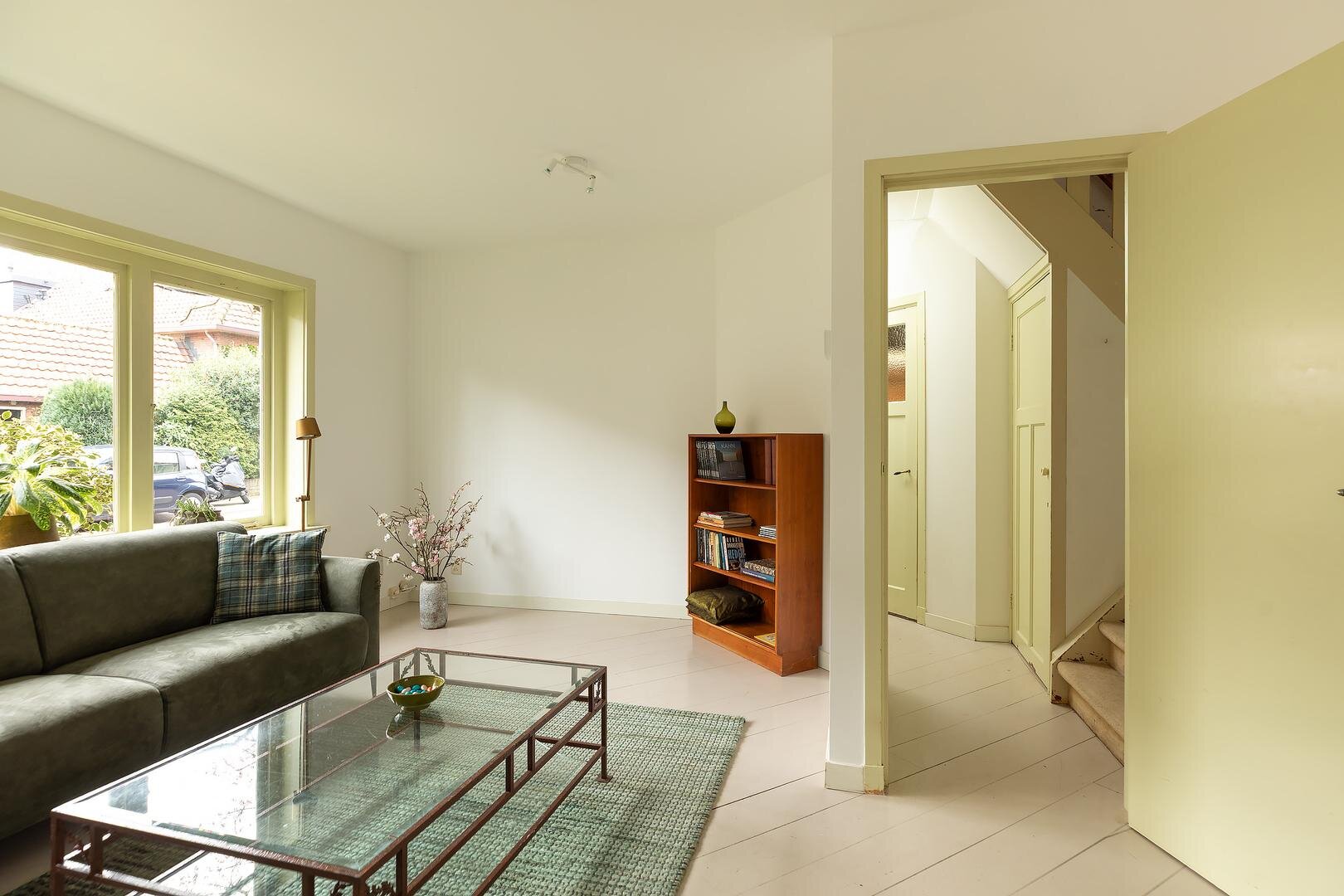 Begane grond: entree, hal, toilet, trapopgang, lichte L-vormige woon-/eetkamer met openslaande deuren naar de tuin, halfopen keuken.