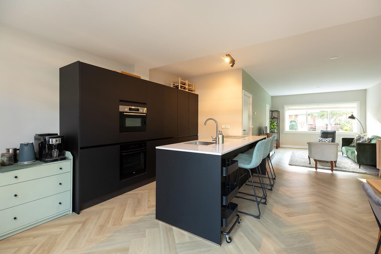 entree / hal, royale en zeer lichte woon-/eetkamer met uitbouw aan de achterzijde, openslaande deuren naar de tuin met hordeur. Moderne open keuken voorzien van afwasmachine, inductiekookplaat met ingebouwde afzuigfunctie, stoom-oven, combi-oven en koelkast met vriesvak en zeer veel opbergruimte.