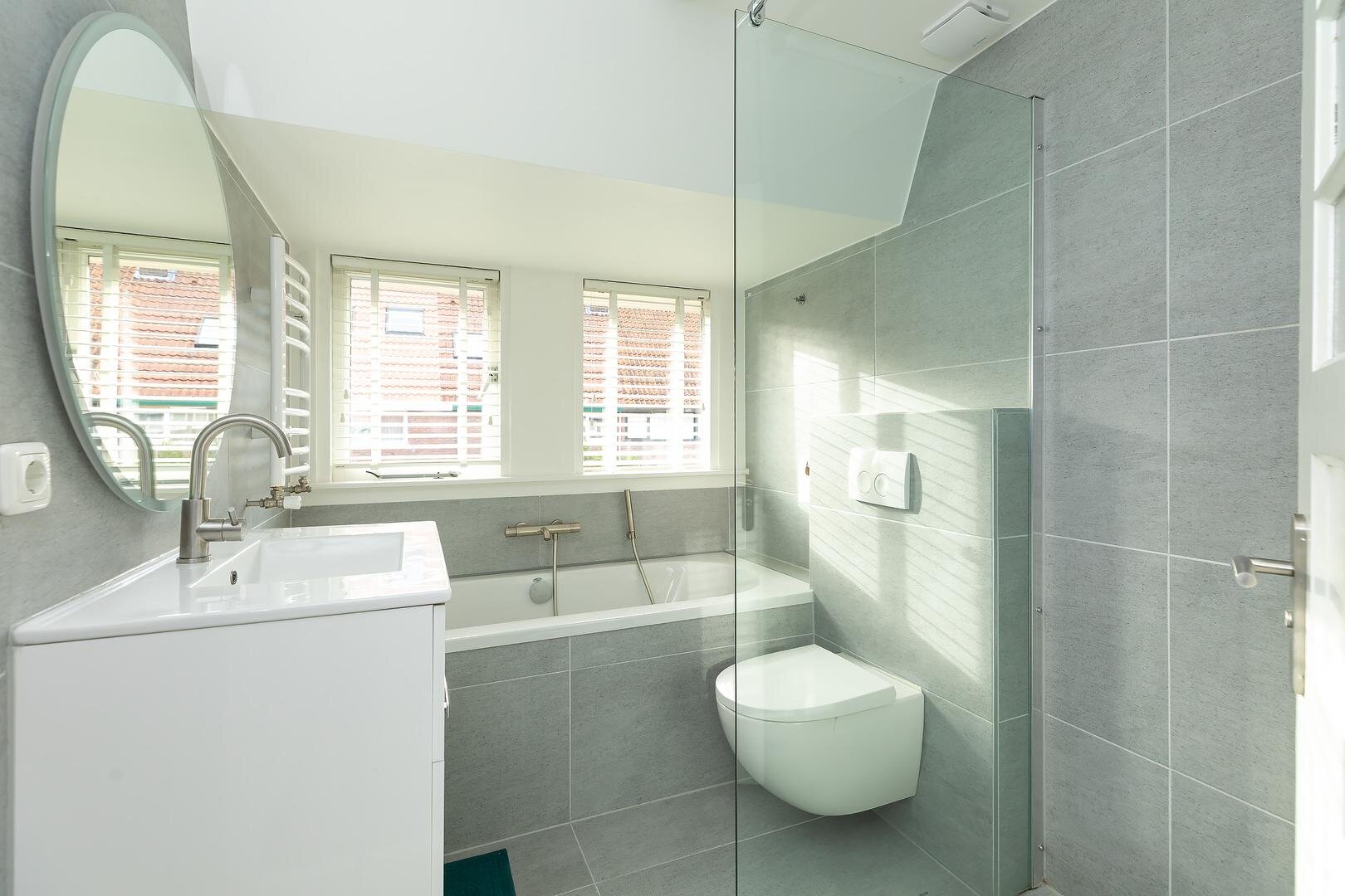 overloop met c.v.-opstelling (Nefit 2021) en aansluiting voor wasmachine/droger, ruime slaapkamer aan de achterzijde met dakkapel, 2e ruim bemeten slaapkamer aan de voorzijde, moderne badkamer met inloopdouche, 2e toilet, ligbad, wastafelmeubel en mechanische ventilatie.