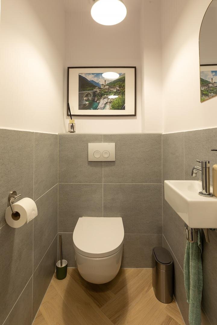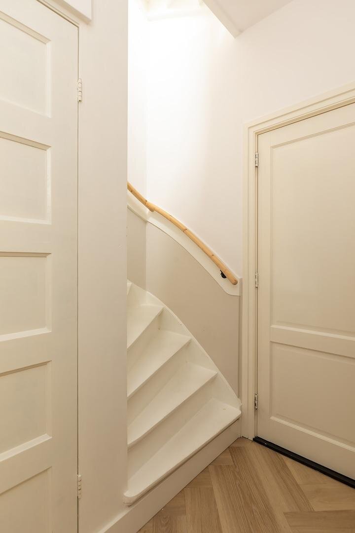 Tussenhal met trapopgang naar de 1e verdieping, hier bevindt zich ook de kelderkast met meterkast en het toilet met een wasbakje.