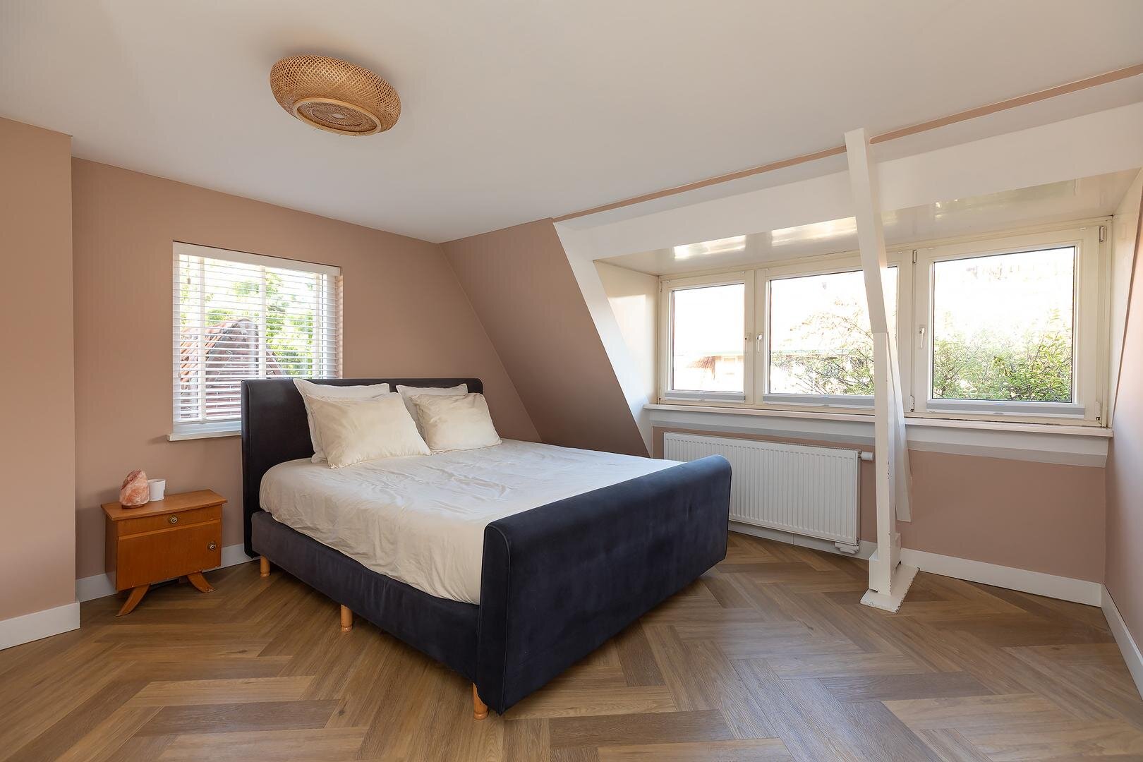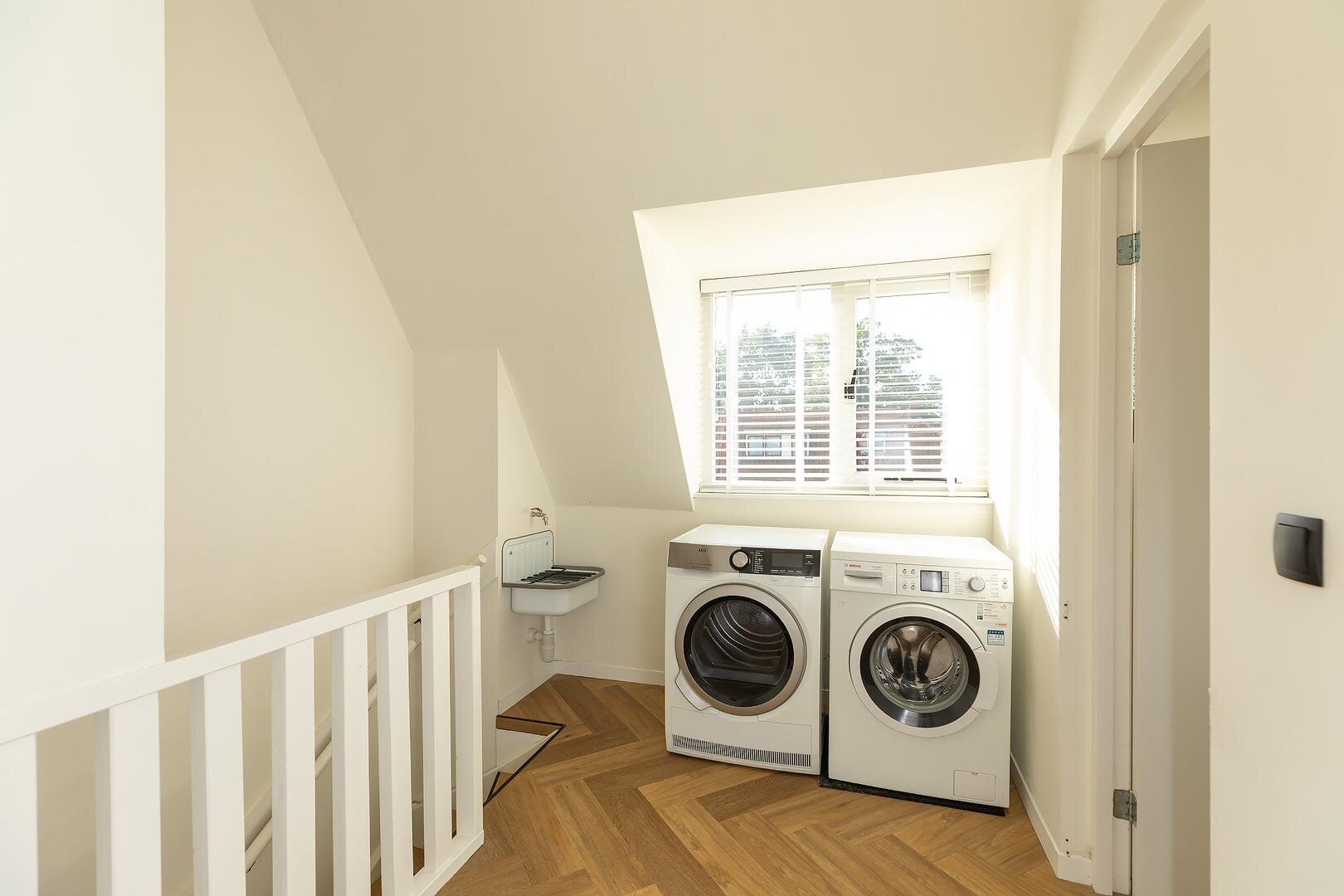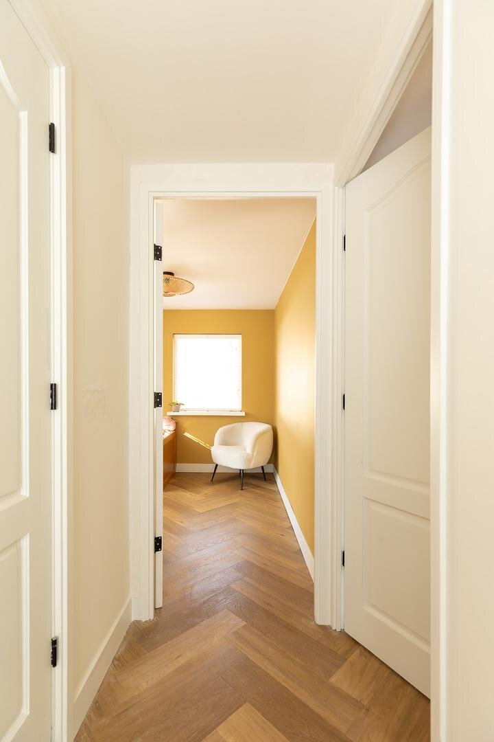 Tweede verdieping: via vaste trap bereikbare voorzolder met daglicht door kleine dakkapel, c.v.-opstelling (2019), aansluiting wasapparatuur, spoelbak en bergruimte achter knieschotten. Fraaie zolderkamer met knieschotten, dakkapel en Velux dakraam. Ook deze verdieping is voorzien van een visgraatvloer.
