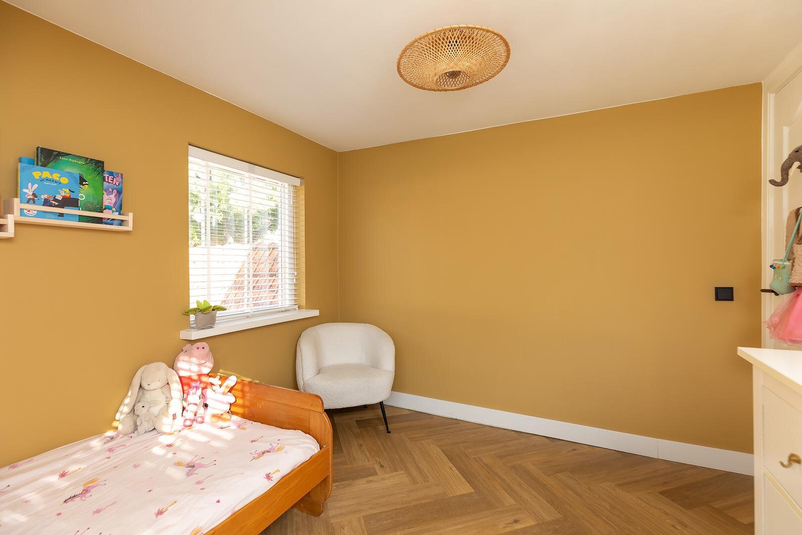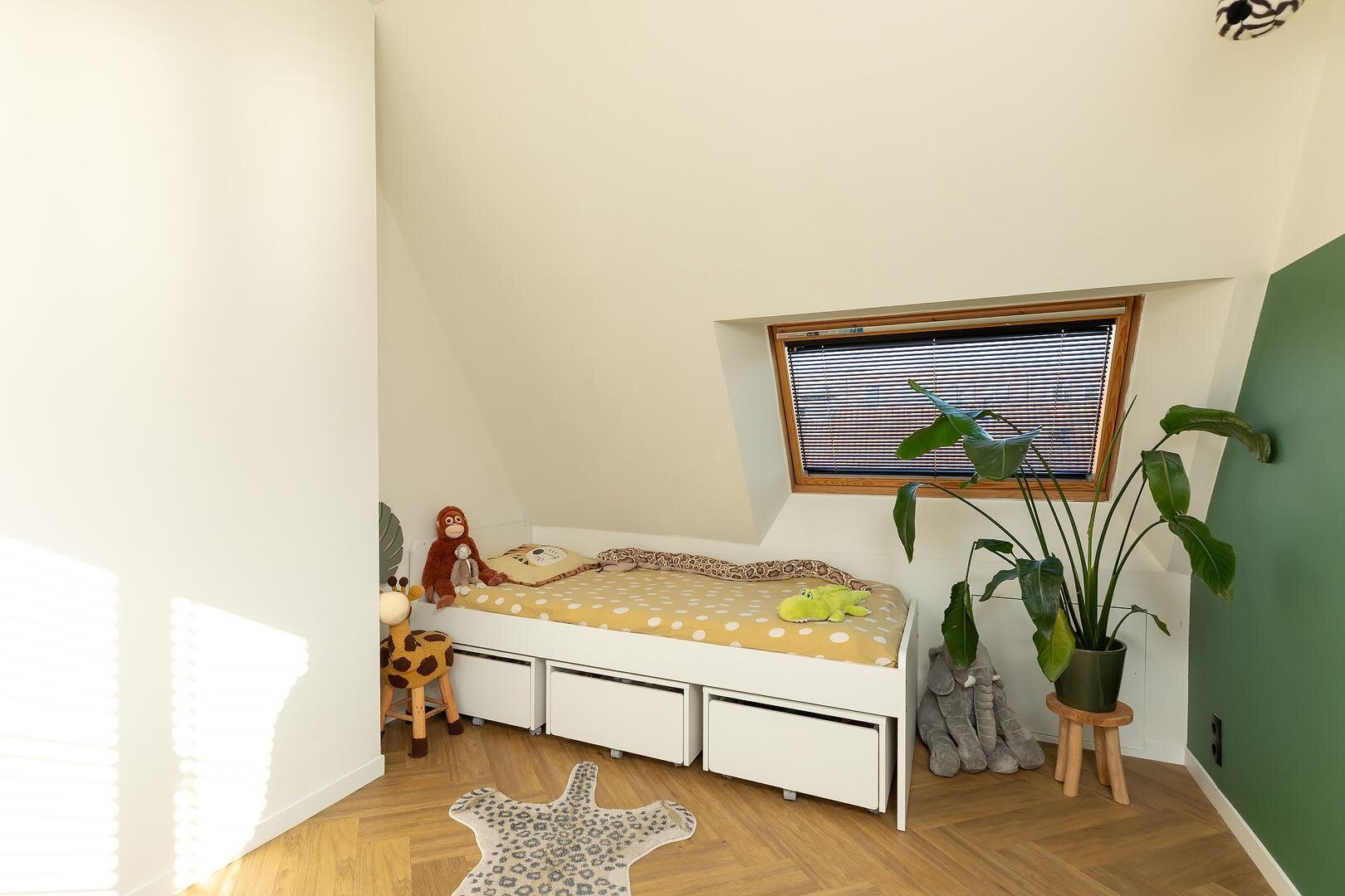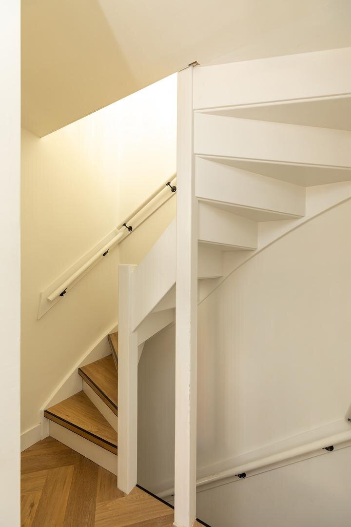 Tweede verdieping: via vaste trap bereikbare voorzolder met daglicht door kleine dakkapel, c.v.-opstelling (2019), aansluiting wasapparatuur, spoelbak en bergruimte achter knieschotten. Fraaie zolderkamer met knieschotten, dakkapel en Velux dakraam. Ook deze verdieping is voorzien van een visgraatvloer.