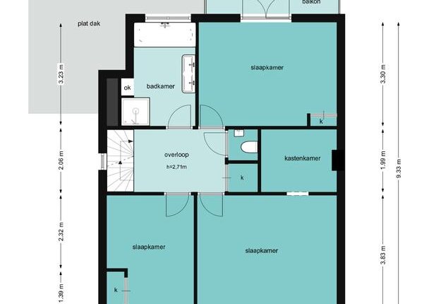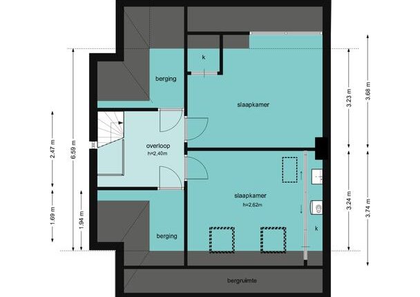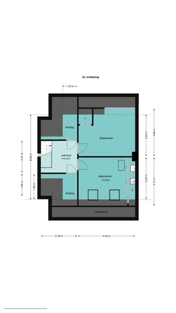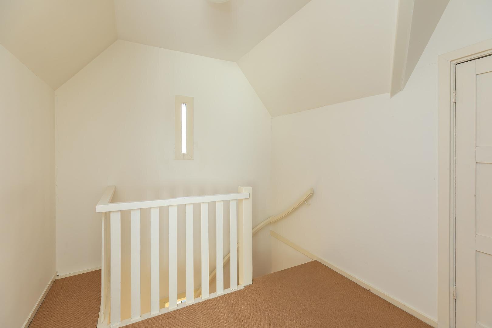 Tweede verdieping: overloop, twee bergingen, twee slaapkamers waarvan één met dakkapel en één met Velux-ramen, kast met cv-opstelling en wastafel en toegang tot de bergvliering.