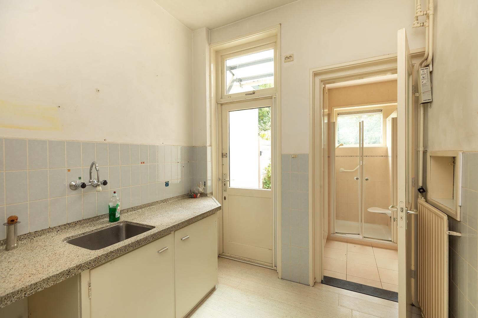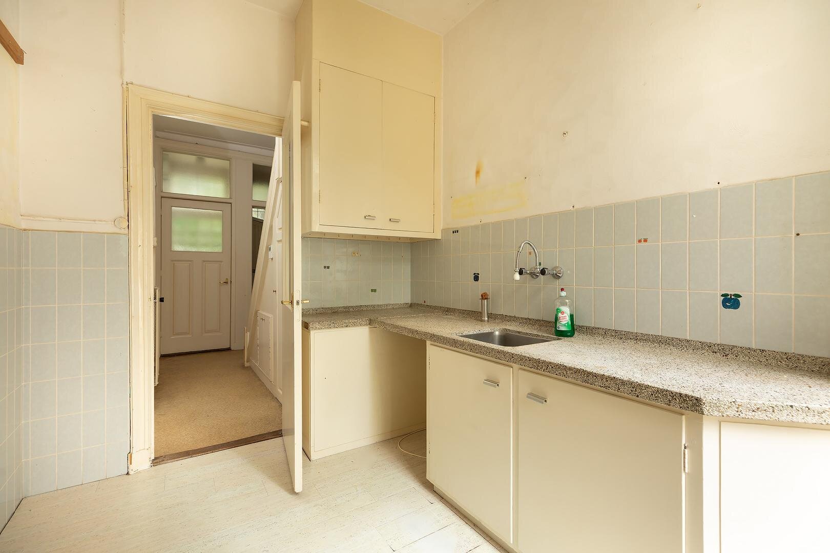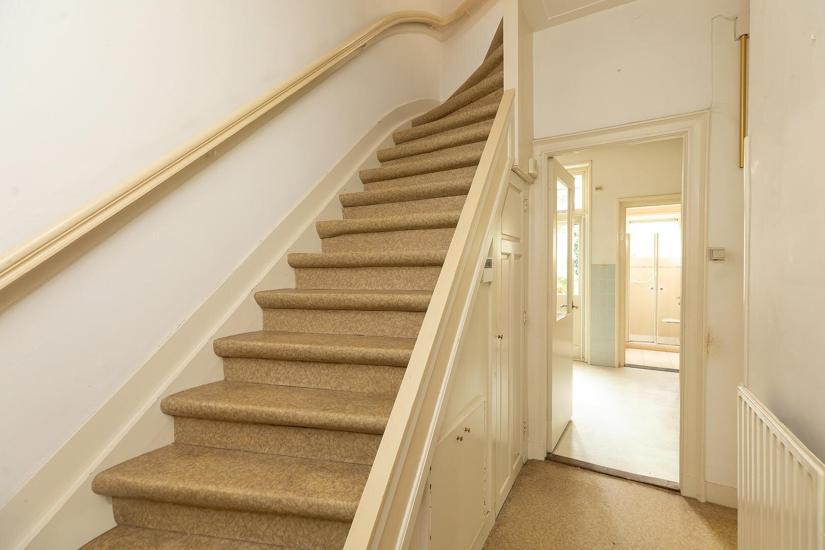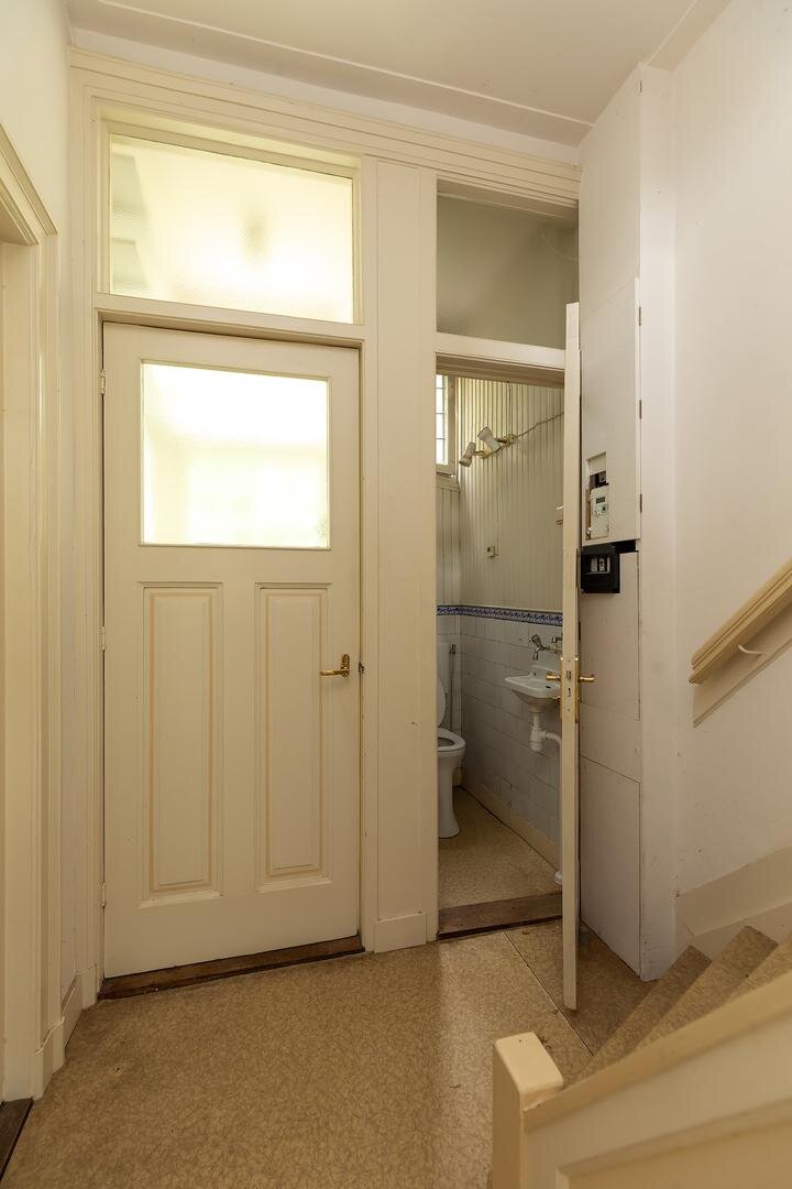 Begane grond: entree, vestibule, gang met trapopgang, trapkast, toegang tot sta-hoge kelder, toilet met fonteintje, uitgebouwde woon-/eetkamer en suite met erker, schouw en veel licht door de raampartijen aan de zijgevel. De originele keuken met granieten blad en deur naar de achtertuin, toegang naar de badkamer met douche, wastafel en bidet.
