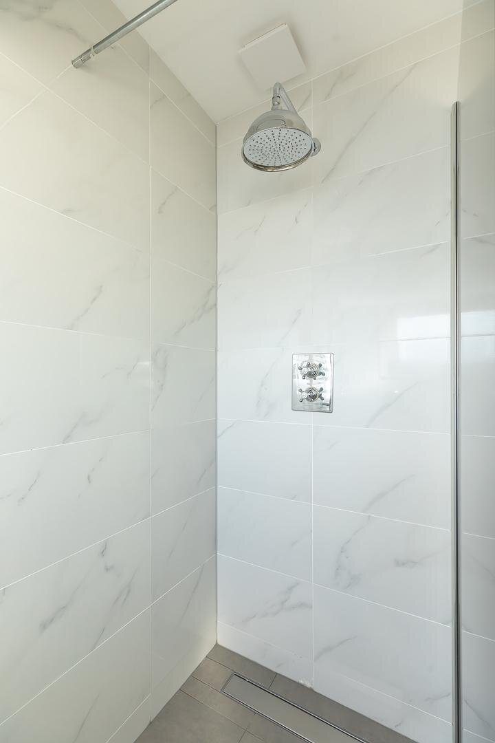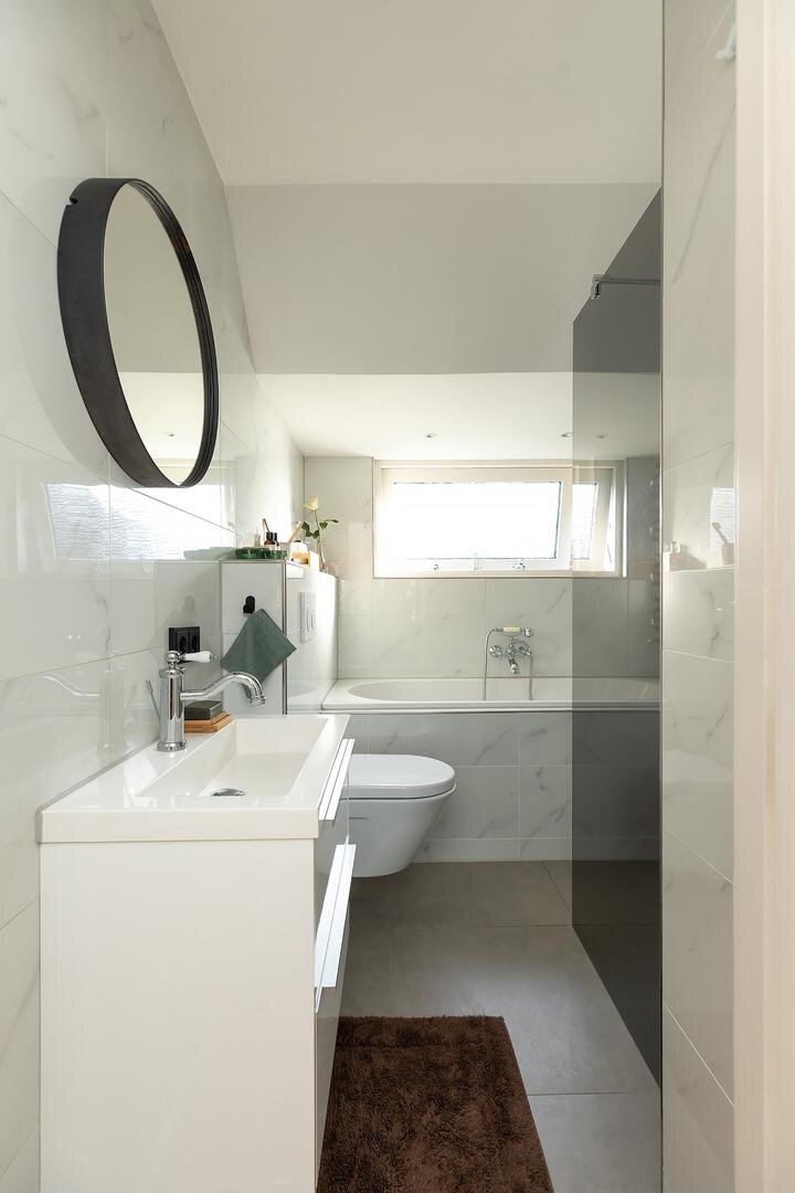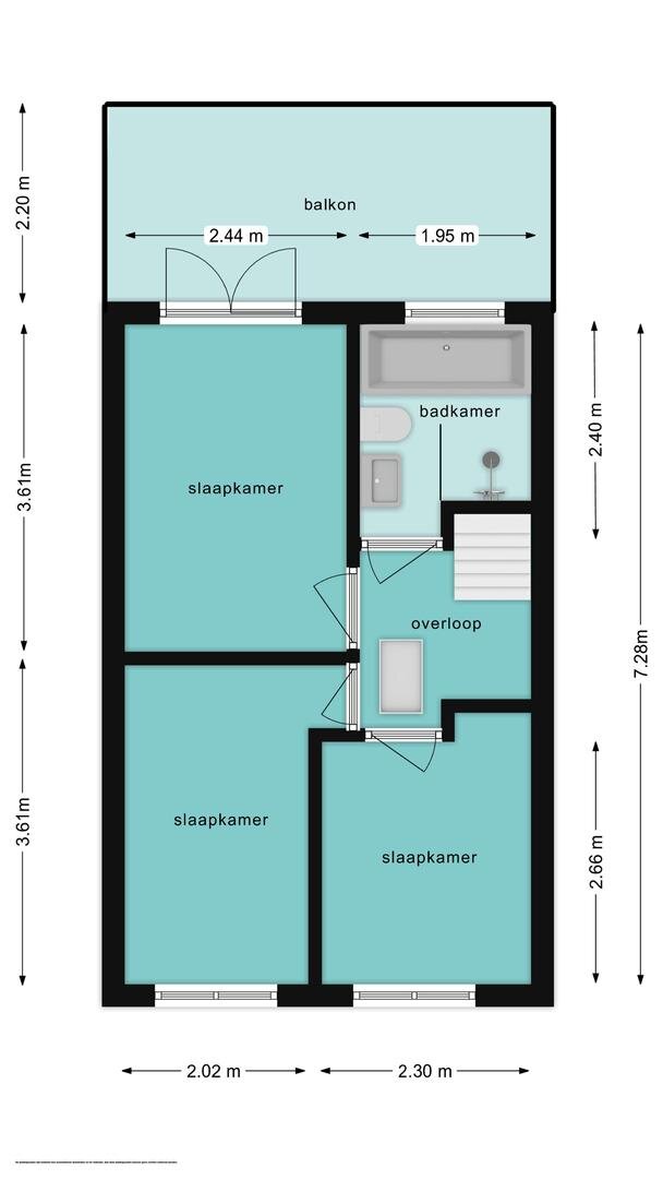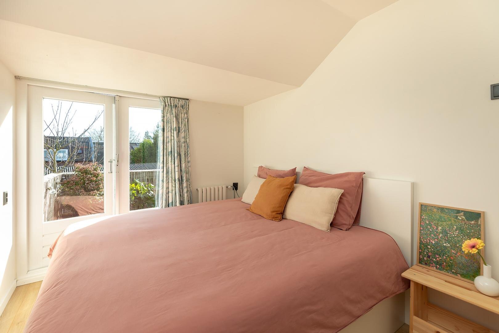overloop, 2 slaapkamers aan de voorzijde en een grotere slaapkamer aan de achterzijde met openslaande deuren naar het balkon. De badkamer is voorzien van een ligbad, douche, toilet en wastafel.