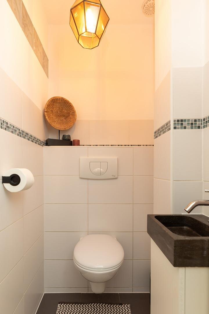 Het toilet bevindt zich in het halletje bij de trap naar de verdieping. Daar is ook de toegang tot de kelderruimte met de c.v.-installatie.