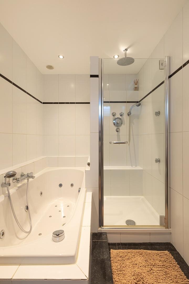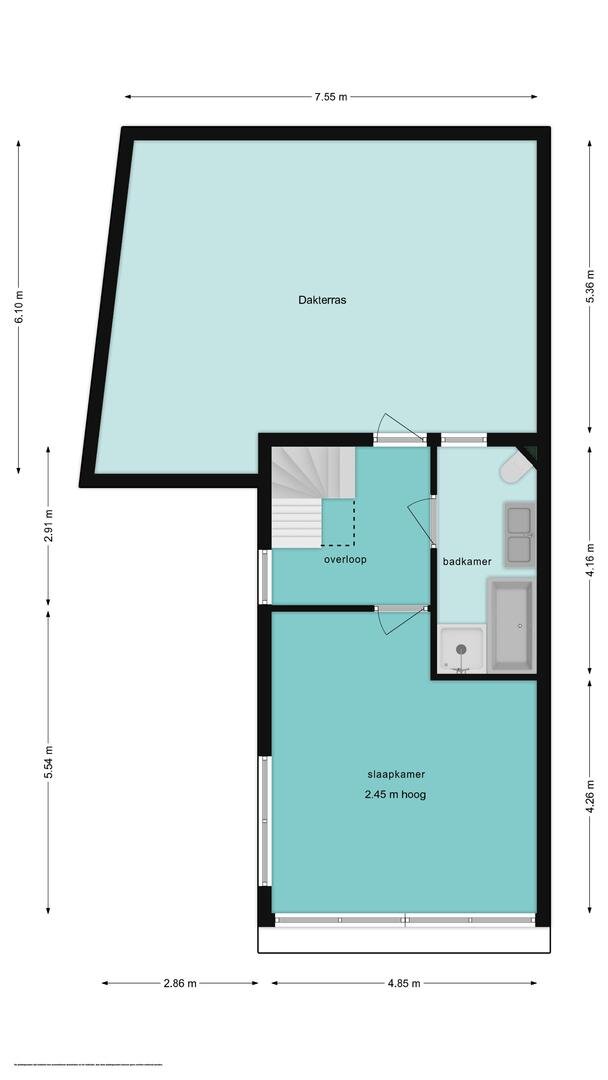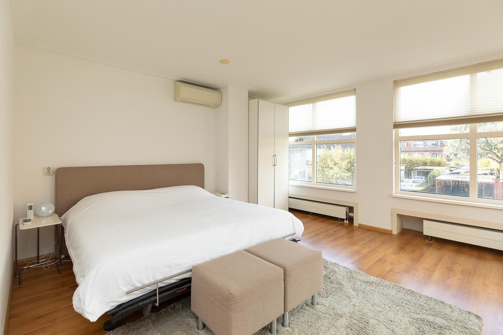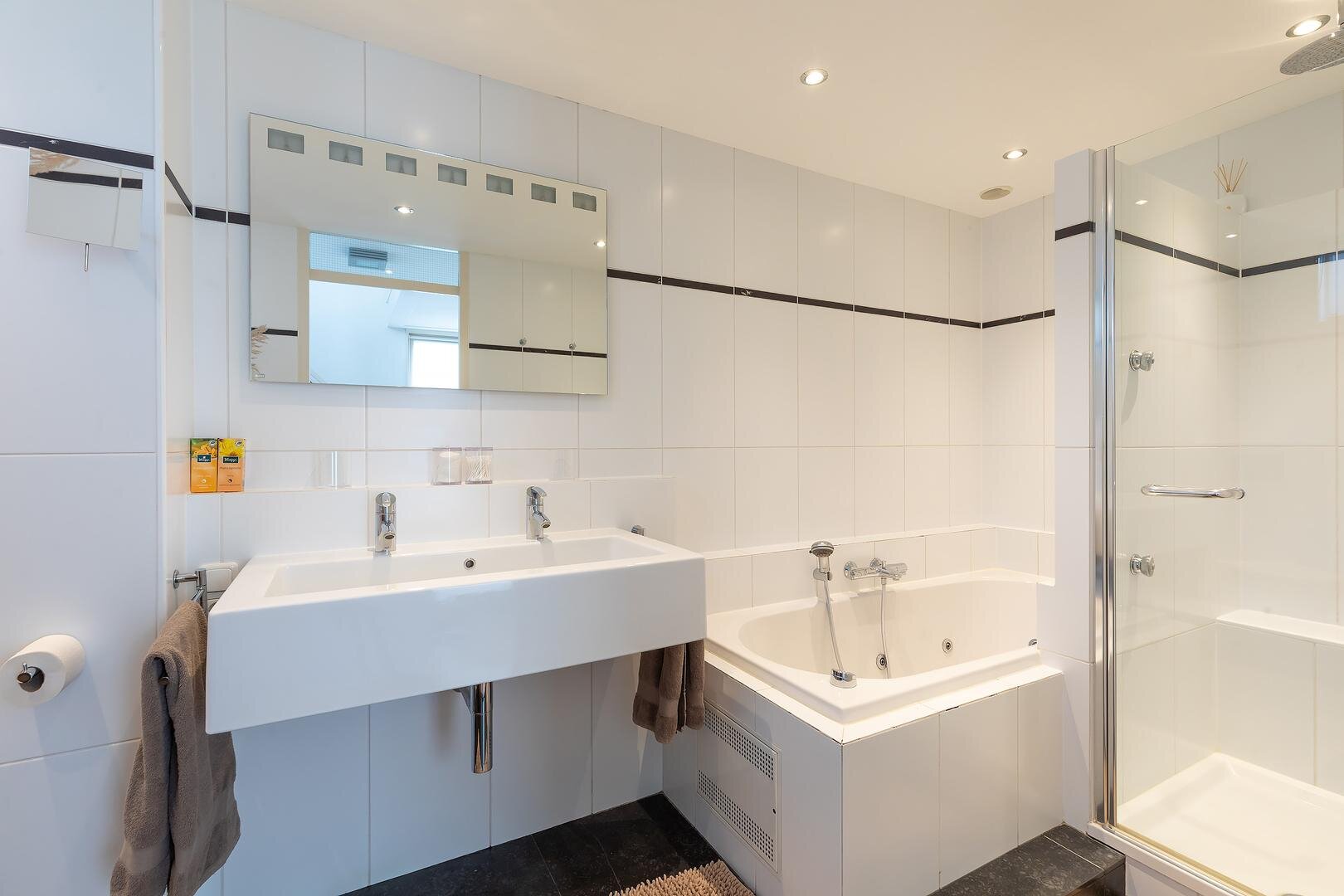 Overloop, badkamer met ligbad, separate douche, dubbele wastafel en tweede toilet. De riante hoofdslaapkamer (voorheen twee kamers) biedt volop ruimte en kan indien gewenst eenvoudig weer worden opgesplitst in twee aparte kamers. Vanaf de overloop is er toegang tot het zeer ruime dakterras, waar je in alle rust kunt genieten van de zon en het uitzicht over de omgeving.