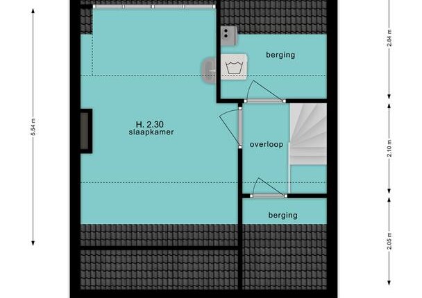 Vaste trap naar ruime zolderverdieping alwaar overloop met bergruimte, separate wasruimte aan de achterzijde met opstelling CV-ketel (Nefit HR 2017) en aansluiting wasmachine en een grote zolderkamer met dakkapel aan de achterzijde, wastafel en bergruimte achter de knieschotten.