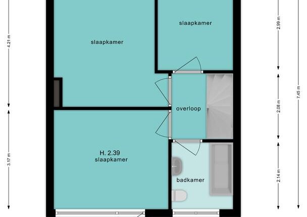 Overloop, ruime slaapkamer aan de voorzijde met toegang tot een balkon met Somfy zonnescherm, grote 2e slaapkamer aan de achterzijde met toegang tot een tweede balkon met automatisch Somfy zonnescherm, kleinere 3e slaapkamer aan de achterzijde met vaste kast, badkamer aan de voorzijde voorzien van ligbad/douche, 2e toilet, wastafel en designradiator.