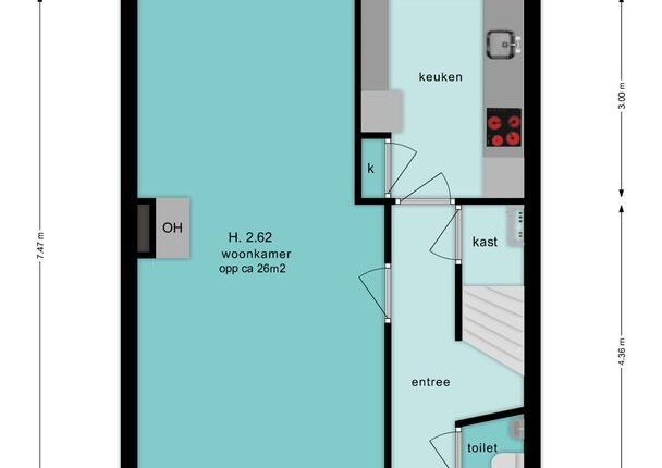 Overdekt entree, gang met parketvloer en trap naar de 1e verdieping, eenvoudig toilet met fonteintje, bergkast onder de trap met meterkast, lichte woon-/eetkamer met parketvloer, elektrische haard en toegang tot de achtertuin, separate keuken aan de achterzijde met tegelvloer, deur naar de achtertuin en voorts voorzien van een dubbel keukenblok met diverse apparatuur waaronder een inductieplaat, koelkast, vriezer, hete lucht oven en close-in boiler.