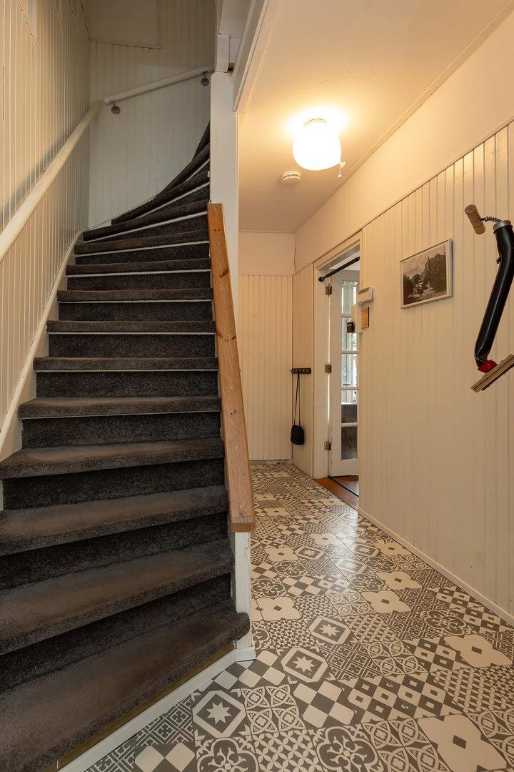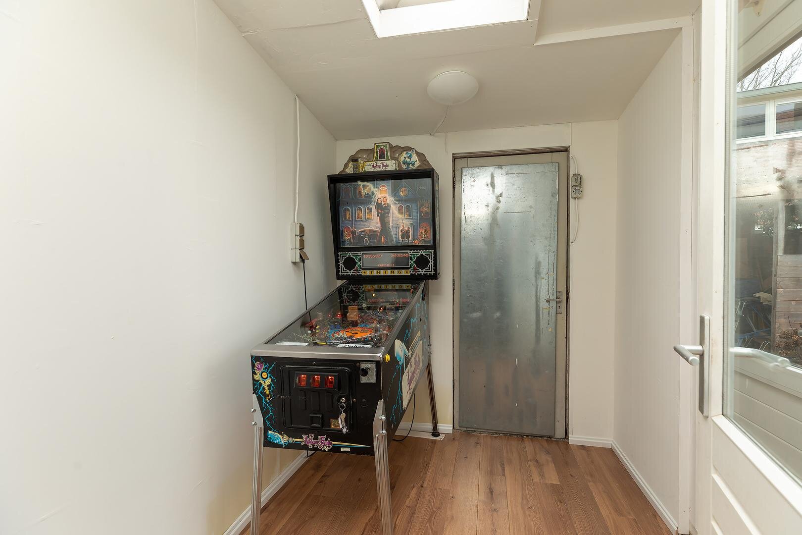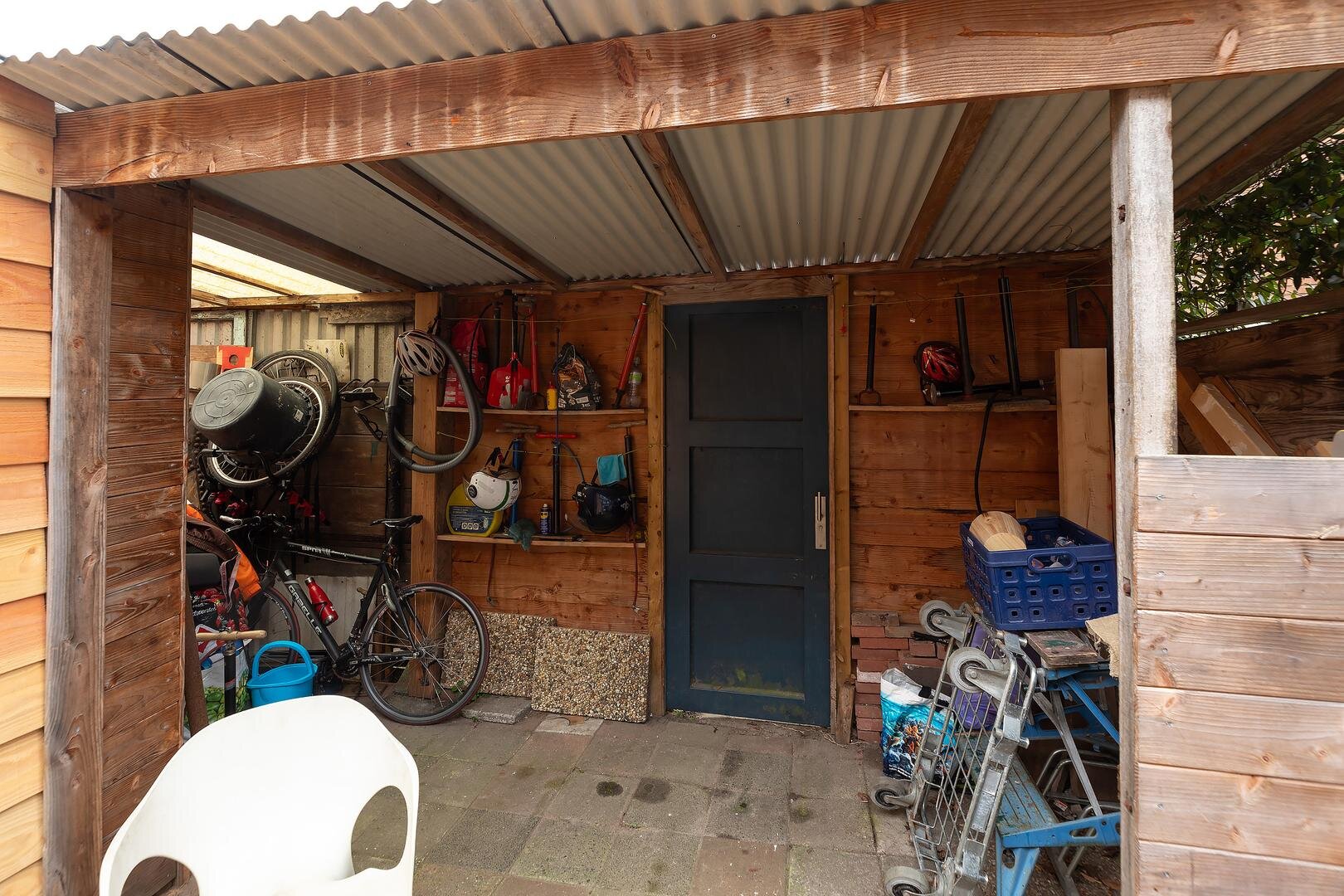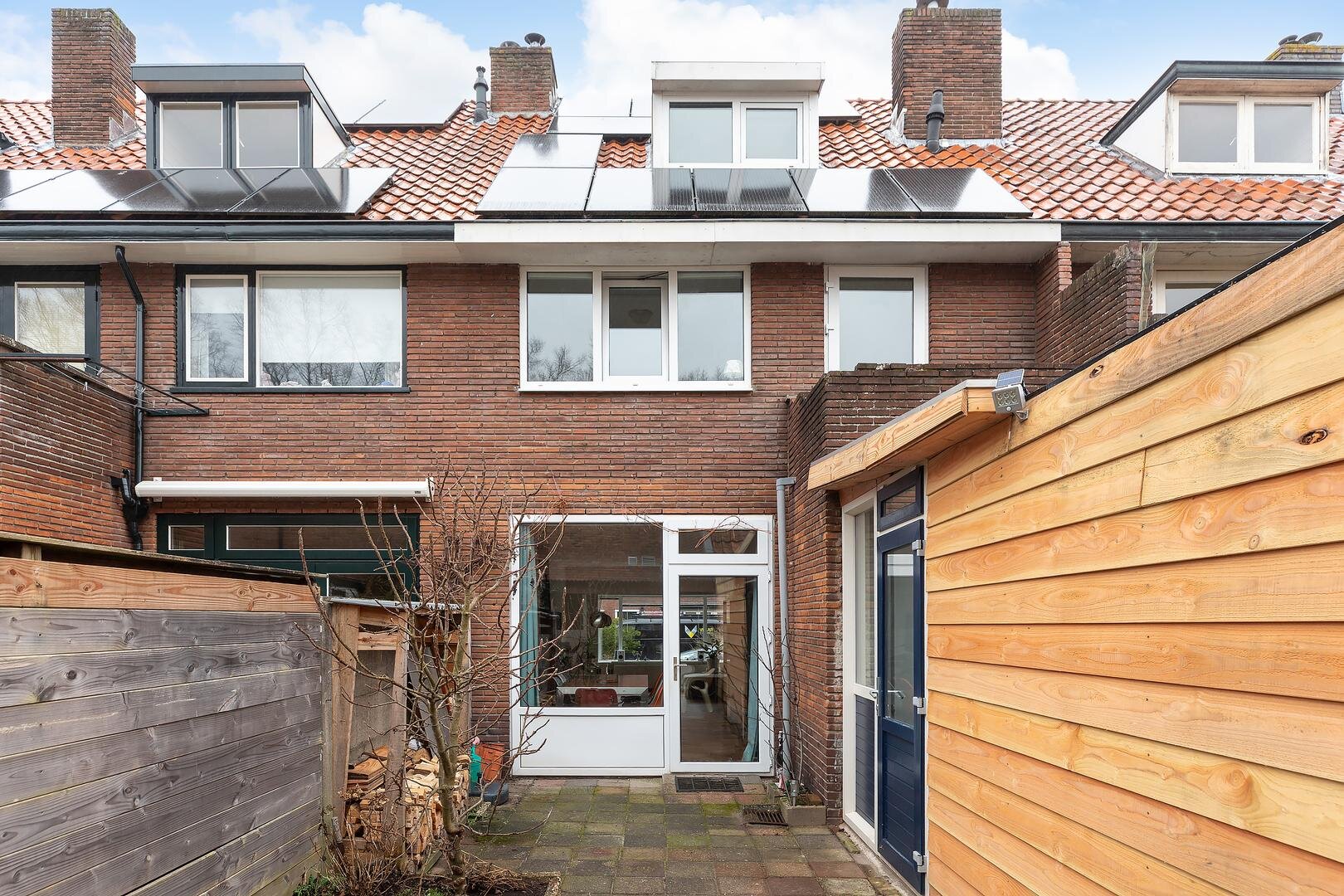 Indeling: entree / vestibule, hal met trapopgang, trapkast en toilet, Lichte woon / -eetkamer met erker aan de voorzijde, visgraat parketvloer, houtkachel en deur naar de achtertuin. De semi-open keuken in L-opstelling is voorzien van inbouwapparatuur en stenen blad. Tussenhal met daklicht en achterdeur naar de tuin en deur die toegang biedt tot de berging. De op het zuiden gesitueerde achtertuin is middels achterom bereikbaar en beschikt over een ruime houten overkapping.