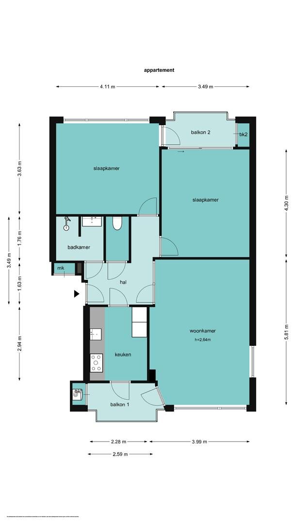 Entree, hal met separaat modern toilet v.v. fonteintje. Moderne keuken welke is uitgerust met Siemens apparatuur, te weten: 5-pits gaskookplaat, afzuigkap, vaatwasser, oven, magnetron en koel-vriescombinatie. Deur naar het balkon aan de voorzijde waar ruimte is voor een zitje. De woon-/eetkamer heeft veel lichtinval en biedt eveneens toegang tot het balkon. Aan de achterzijde van het appartement zijn twee ruime slaapkamers aanwezig. De hoofdslaapkamer heeft een schuifpui naar het overdekte tweede balkon en ook de tweede ruime slaapkamer biedt toegang tot balkon met bergkast. Moderne badkamer voorzien van (inloop)douche, wastafel en wastafelmeubel.