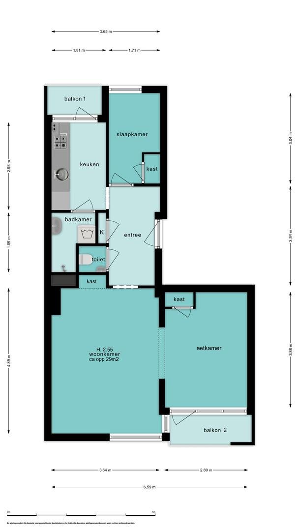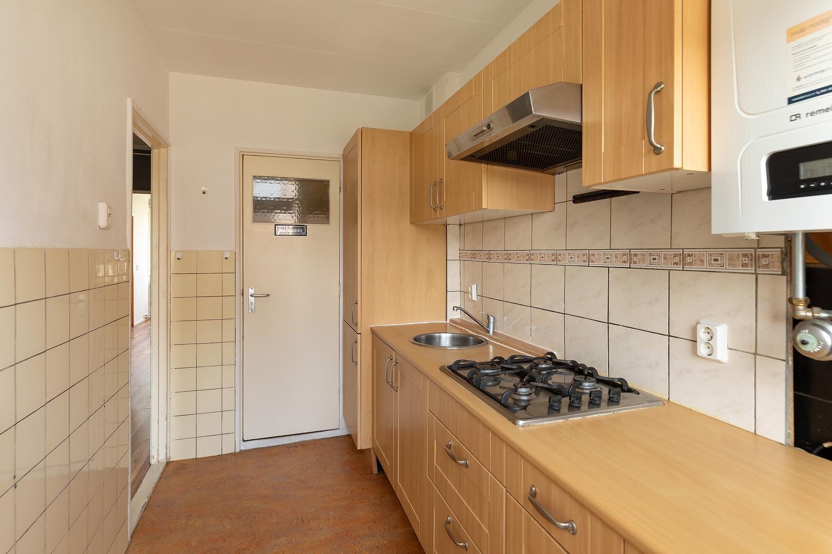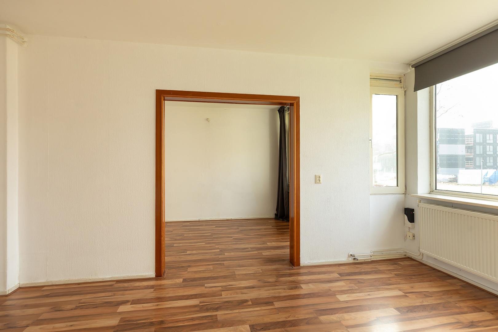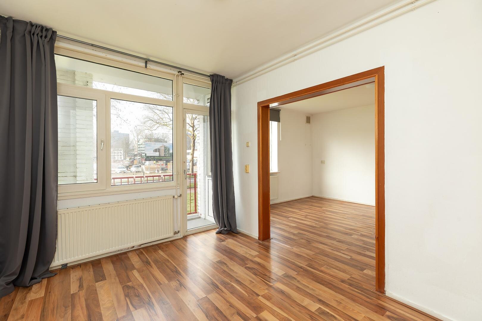 Entree, hal, toilet, lichte woon-/eetkamer (voorheen 2 kamers) met vaste kasten en toegang tot het balkon, 1e ruime slaapkamer hoofdslaapkamers aan de voorzijde en een 2e kleinere slaapkamer, keuken met apparatuur, vernieuwde C.V. opstelling (Remeha 2024), toegang tot het balkon, badkamer met douche, wastafel en wasmachine-aansluiting.