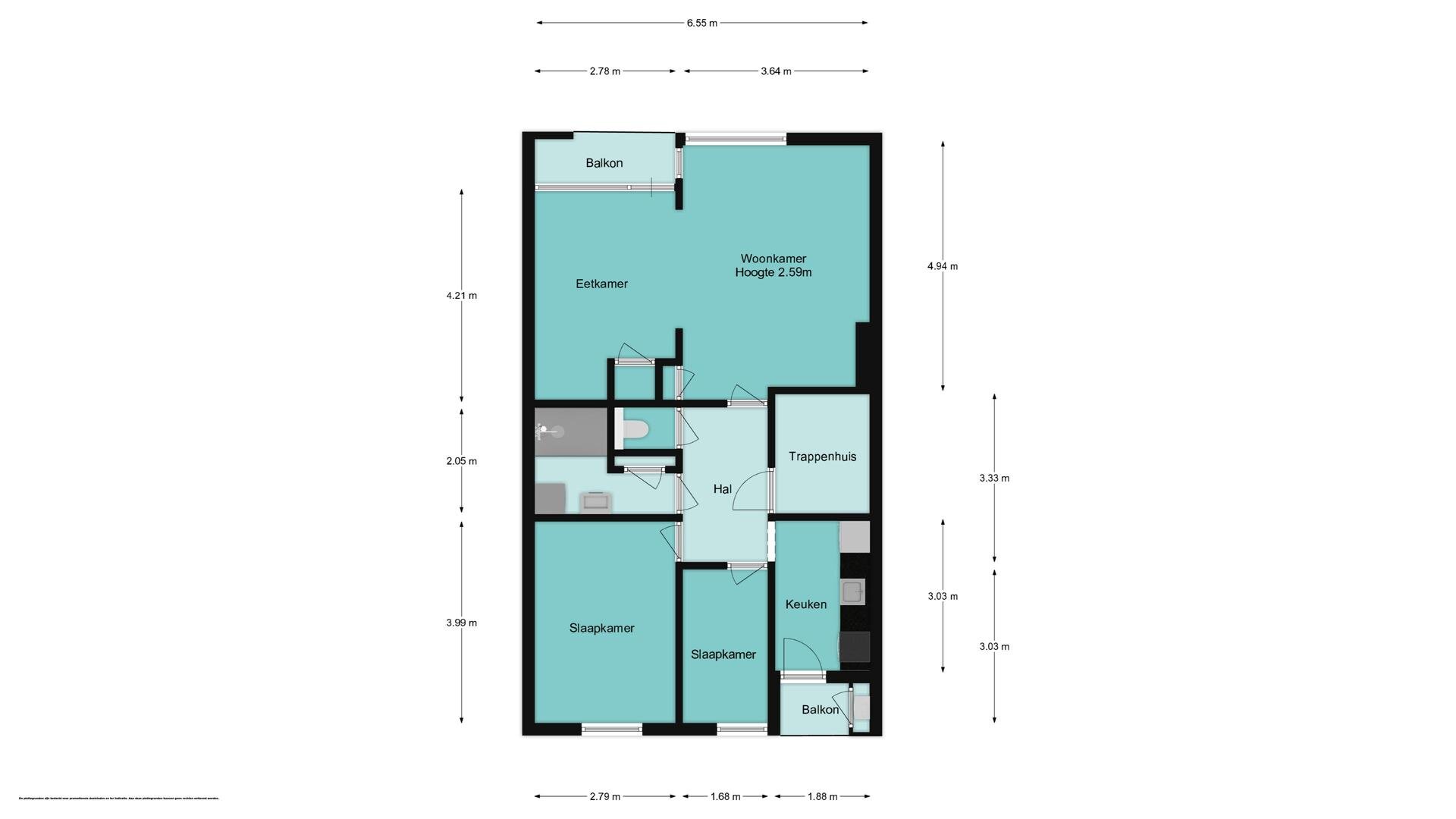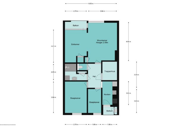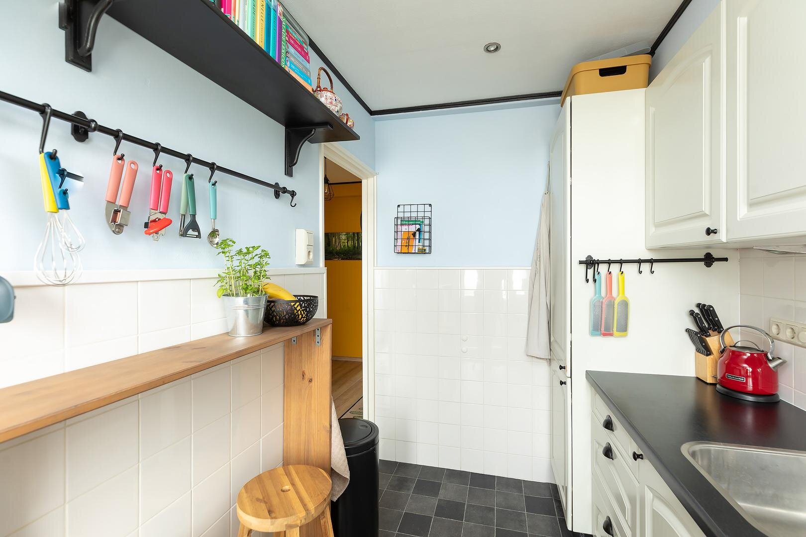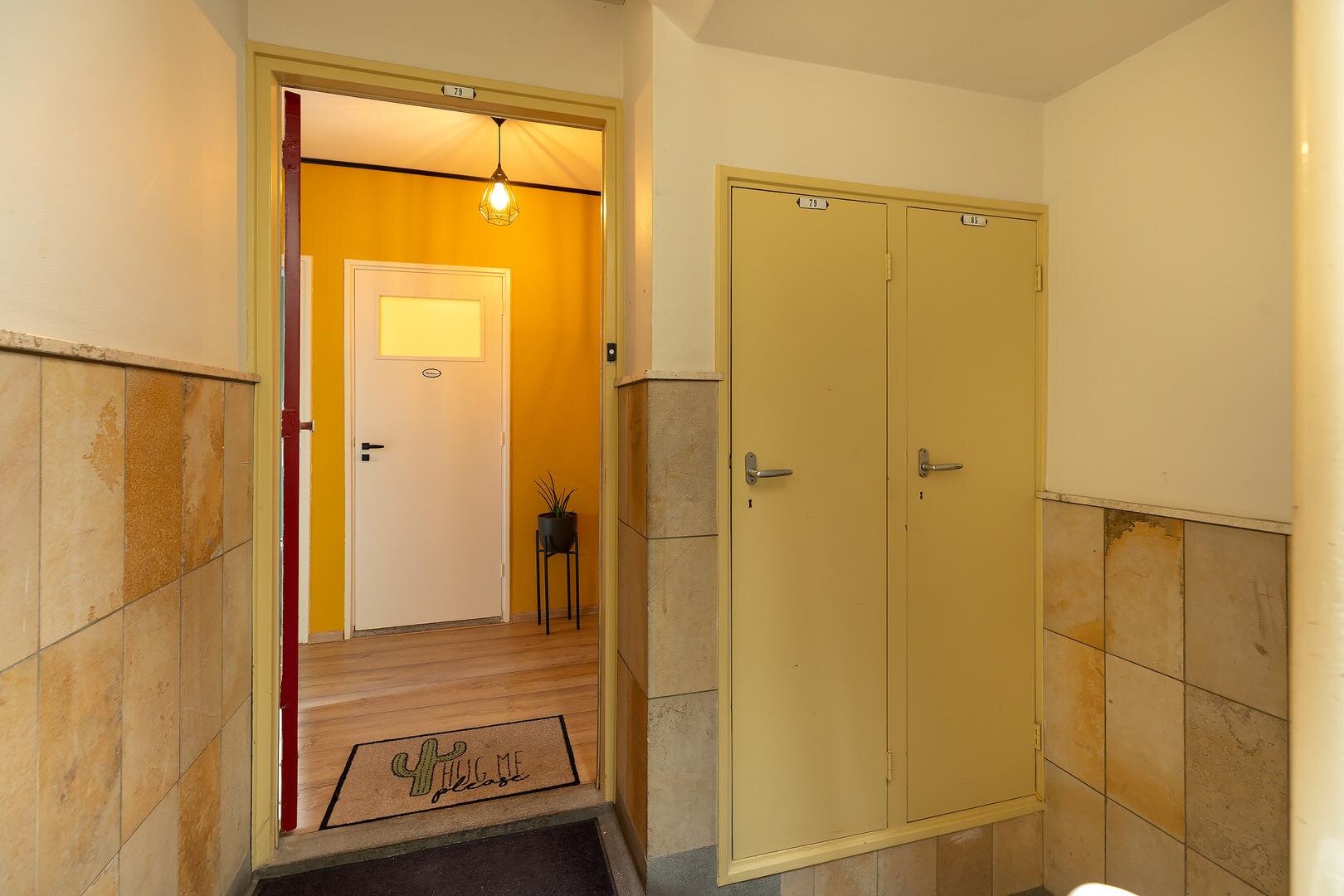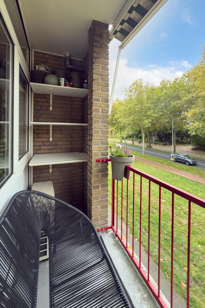 Entree, hal, lichte woon-/eetkamer (v/h 2 kamers) met vaste kasten en toegang tot het balkon, slaapkamer aan de voorzijde en een 2e kleinere slaapkamer. Moderne badkamer met douche, wastafelmeubel, ruime vaste kast en aansluiting voor de wasmachine. Separaat toilet. De keuken is voorzien van een koelkast, vriezer, kookplaat en combi-oven. Vanuit de keuken is het balkon aan de voorzijde bereikbaar, hier bevindt zich ook de cv-ketel. Aan de kant van de woonkamer is een elektrisch zonnescherm aanwezig.