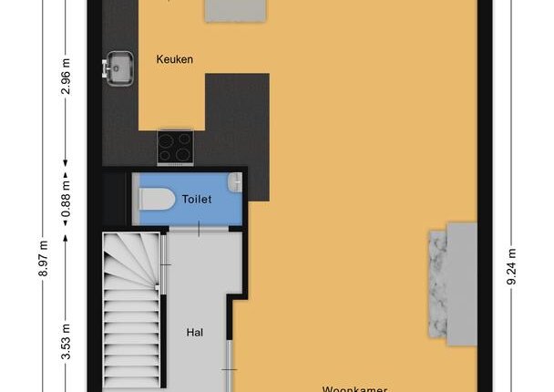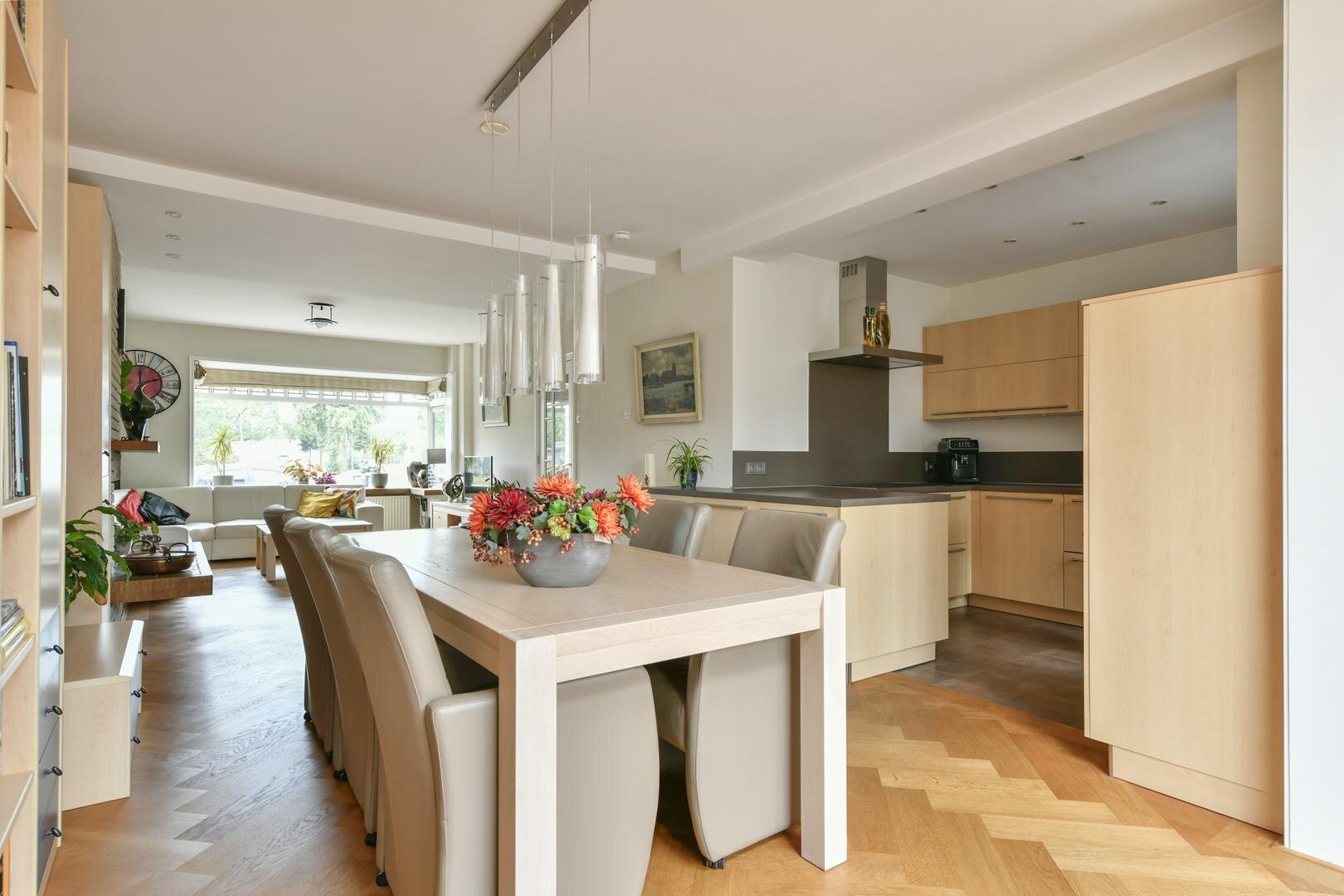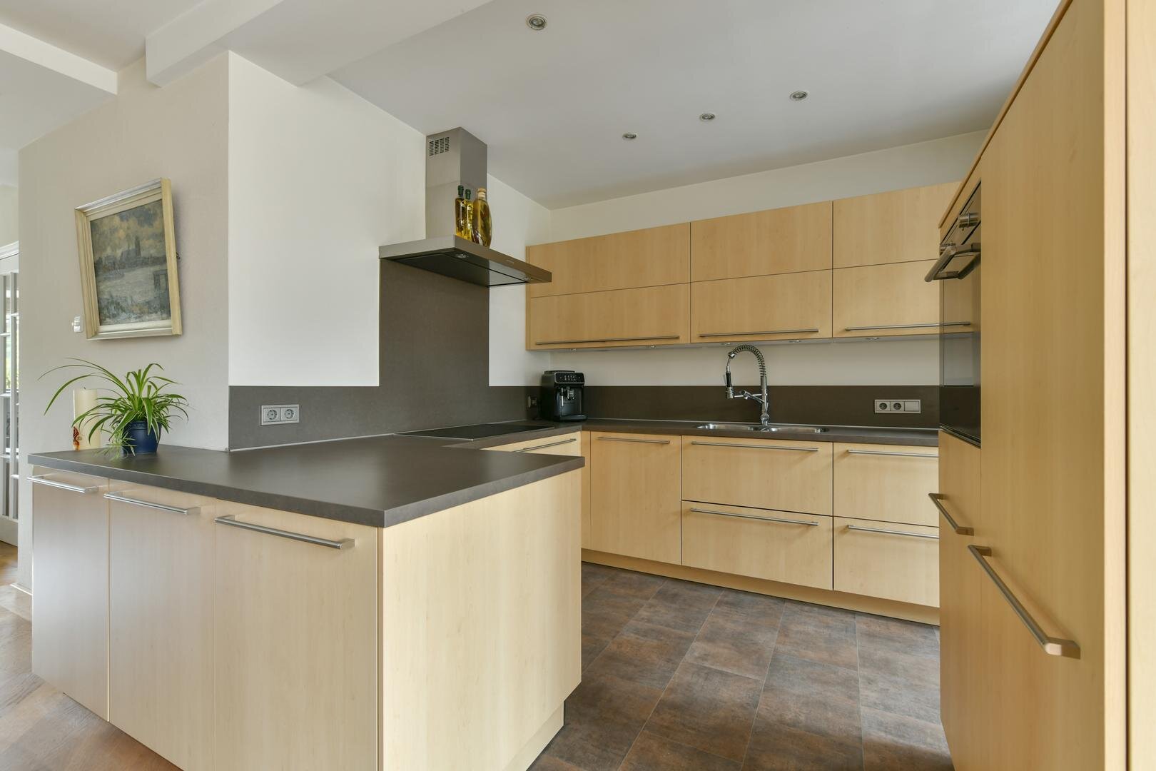Begane grond: Entree met opengewerkte vestibule, hal met trapopgang, meterkast en toiletruimte. De royale woonkamer met open haard en fraaie houten parketvloer is aan de achterzijde uitgebouwd tot een praktische werkruimte – ideaal voor thuiswerken. De moderne open keuken is voorzien van inbouwapparatuur (keramische kookplaat, afzuigkap, koelkast, oven) en geeft toegang tot de bijkeuken met vaatwasser.