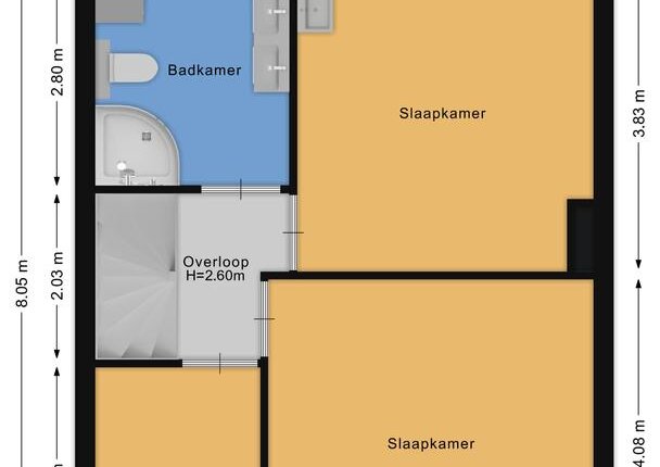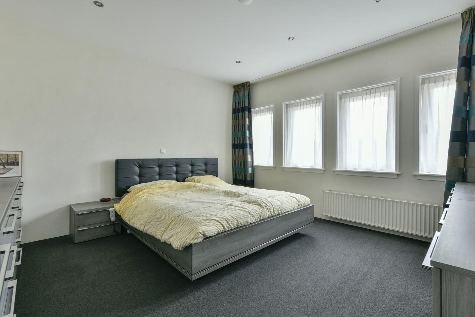 Eerste verdieping: overloop, eerste slaapkamer aan voorzijde (ca. 6 m²) nu in gebruik als walk-in closet, tweede slaapkamer aan voorzijde (ca. 16 m²), derde slaapkamer aan achterzijde (ca. 14 m²) en complete badkamer met dubbele wastafel, douche, toilet en aansluiting voor wasmachine en droger.